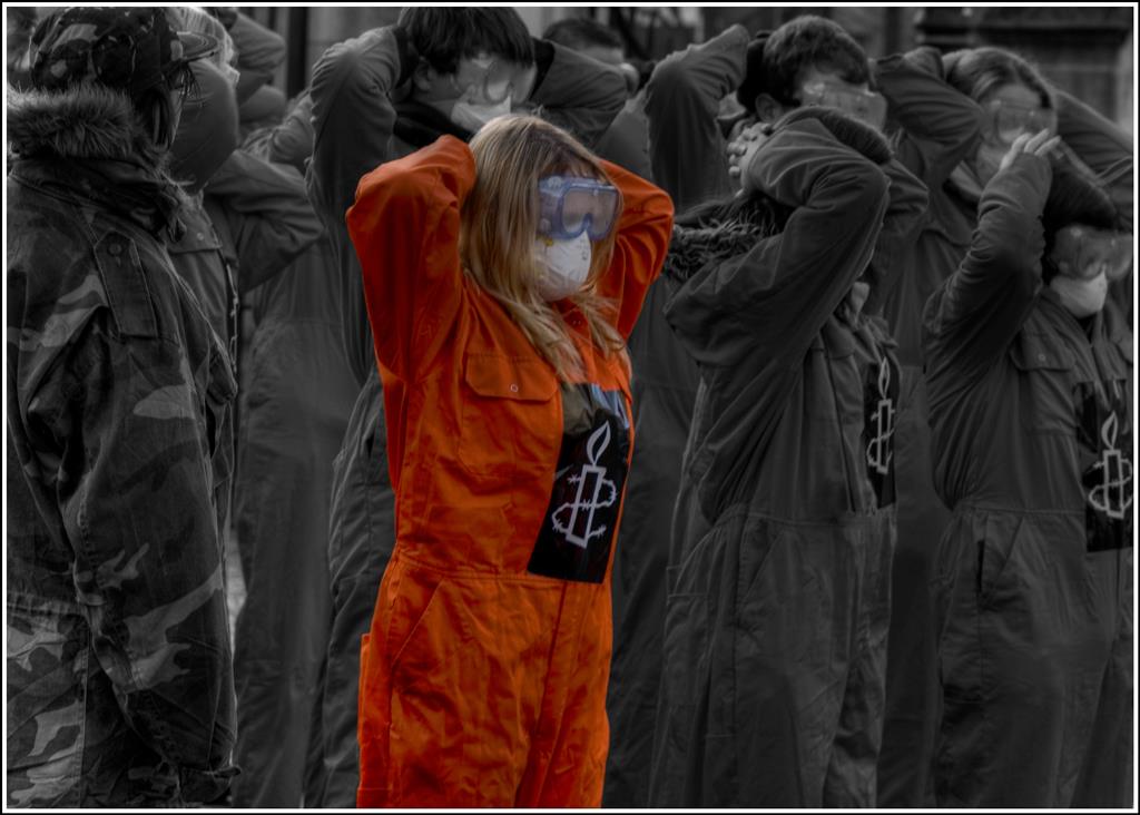 Protest – Amnesty international protest against the appalling treatment of prisoners in Guantanamo bay. One girl remains in colour ( singled out).ProtestHills – A couple of hikers stand out in colour as they make their way in to the heart of the Mourne Mountains.