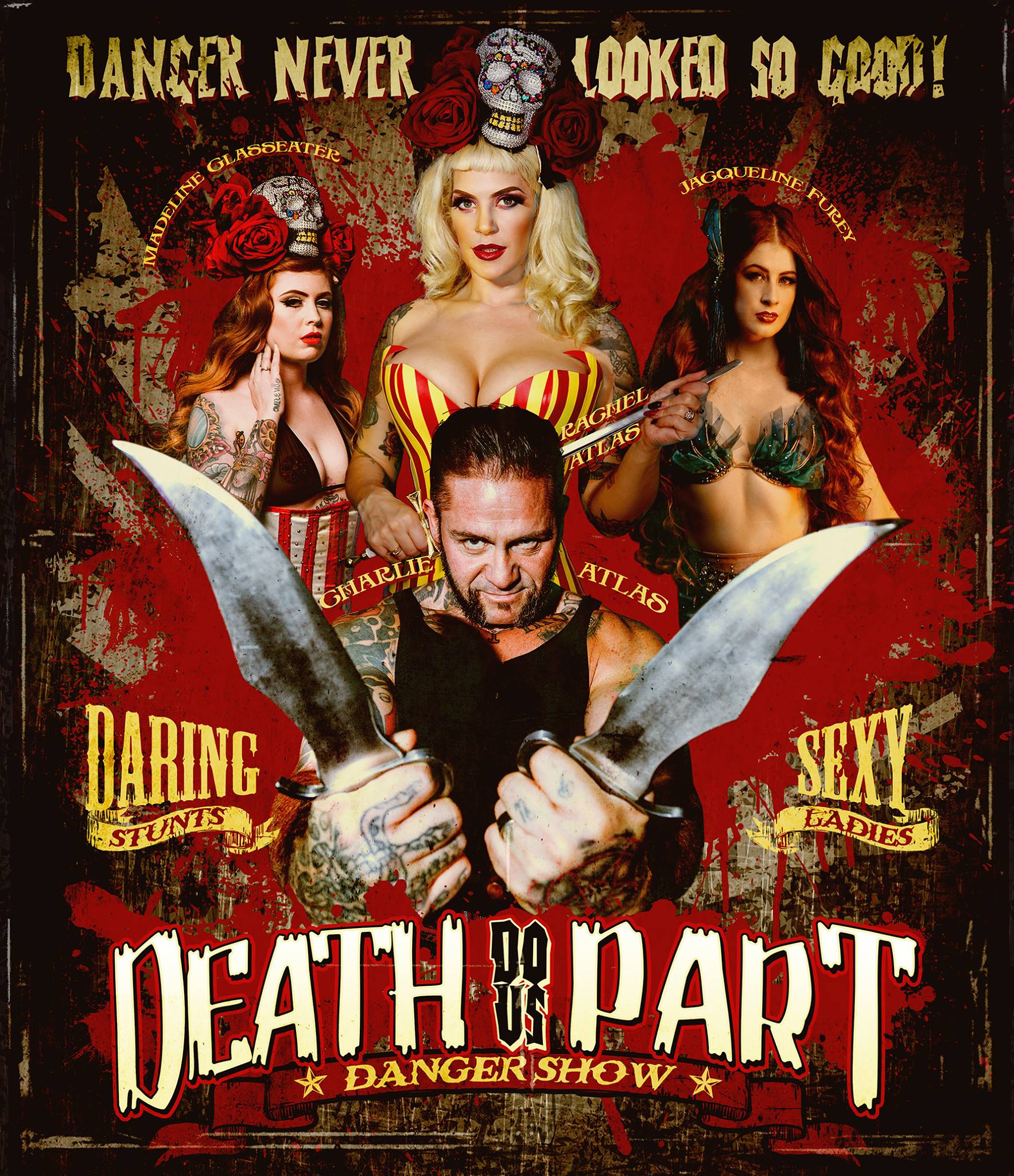 Are you ready to Deathdousparty?  The Death Do Us Part Danger Show is a thrilling, sexy cabaret show like no other.  Featuring knife-throwing, sword-swallowing and whip-cracking amongst other spectacular acts, along with a stunning international cast, Danger really never looked so good!  They feature acts that are a unique fusion of traditional circus, sideshow, burlesque and magic presented with a lot of humour, audience interaction and modern twists in a spectacular world-class show . They have toured on three continents with the world famous Pretty Things Peepshow and this is the first UK(and Ireland) tour of their solo show.