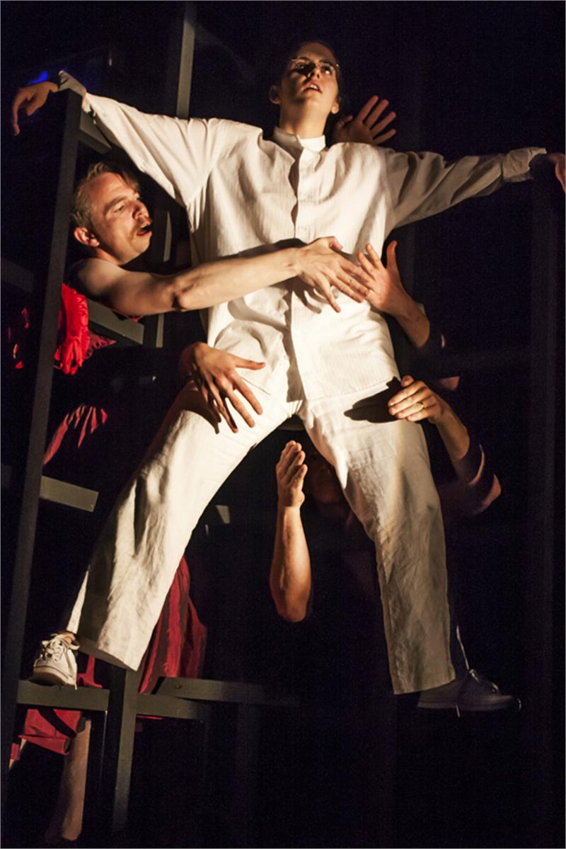 Lighting plays a large part of the 5 man production, casting shadows that prostitutes can creep in and glowing red on halls where a Minotaur awaits. Some religious scenes are lit in such a way as if the light of god from up above where shining down onto his would be disciple. Black and white too is used to great effect as Stephen remains in all white though-out (bar a suit at the very end) whilst the church and it’s advocates are dressed in black, as Stephen can take no more of the endless preaching bout hell fire he lies out arms straight out on the floor, all in white, as if a mirror image of the priest looming over him all in black.