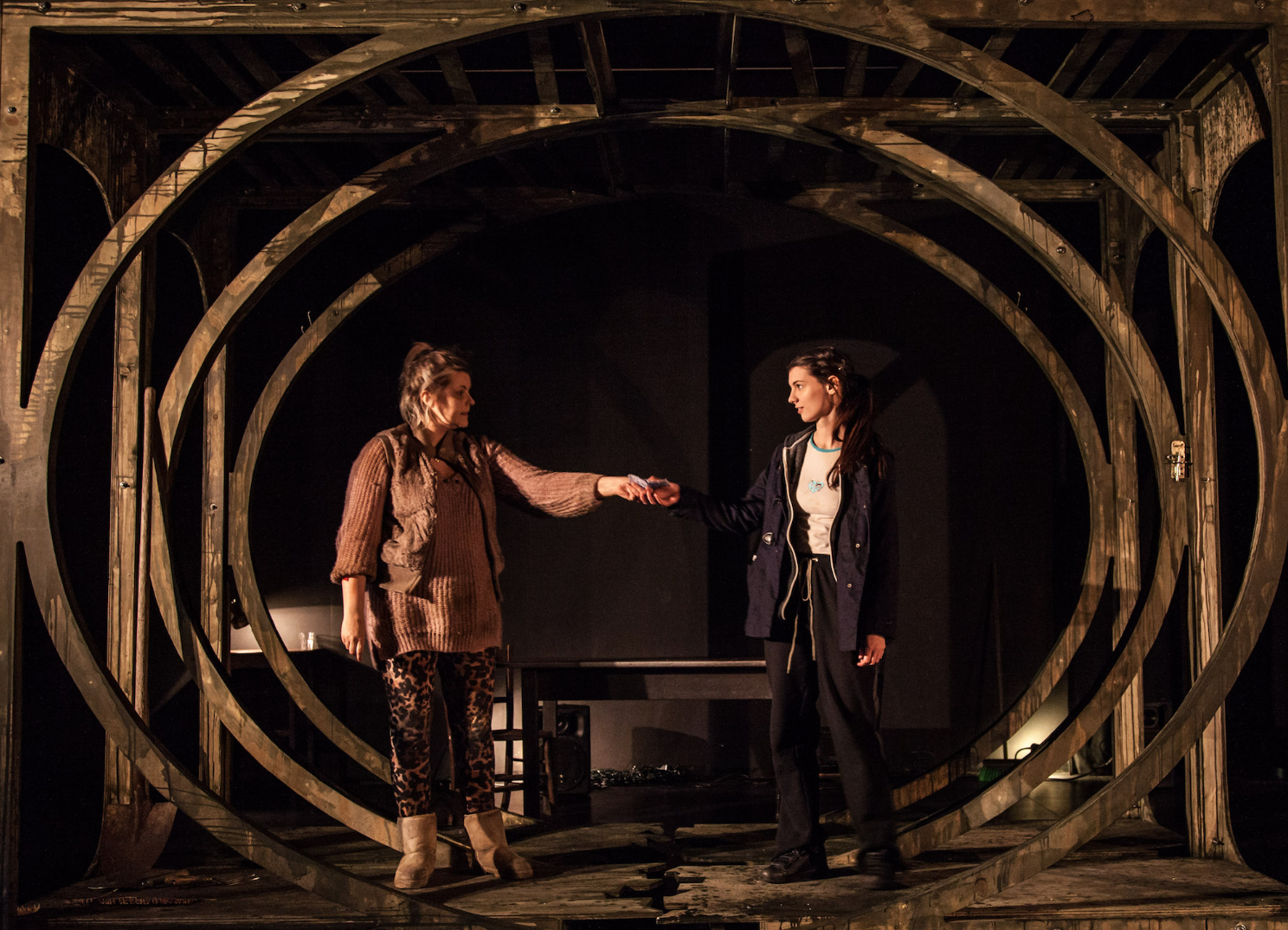Set in the innovative and intriguing landscape of an old dilapidated house, it’s clear that this is a family home, but not as we know it. Ciaran Bagnall’s impressive set sees swathes of rotten wood arranged in an almost skeletal fashion, separated into four, to make this a versatile and unorthodox prop.