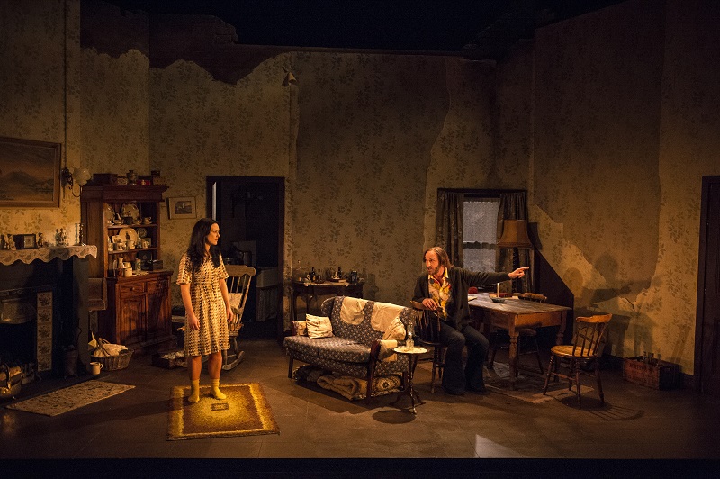 Alyson Cummins has excellently designed a foreboding set, displaying the interior of a dilapidated parlour house which reflects both the gloomy desolation of Belfast at the time and the solemn hearts which occupy the household within.  Carol Moore convincingly plays the bible thumping protestant ghost of Lily Mathew’s with the energy and bitter confusion witnessed by many during a lifetime of religious and political upheaval. Local history is an overwhelming force dominant throughout the play. Parker himself said that “Plays and ghosts have a lot in common. The energy which flows from some intense moments of conflict in a particular time and place seems to activate them both”.  This is all too evident in Pentecost.  Judith Roddy as Marian offers a quick witted yet sombre soul who has become embittered by a life steeped in both tragedy and monotony. Her on-stage interaction with estranged husband Lenny offers both comic relief and an edge of exhausted contempt, while their personal history slowly unveils why.  Paul Mallon plays Lenny, a university drop-out and struggling musician, who is at odds with everything around him, from his failed relationship with Marian to local religion as a destructive force in our society. In one scene his interaction with Will Irvine (playing Lenny’s friend, Peter) holds the audiences gaze in captivated silence as he talks about loss and his time with the estranged Marian.  Will Irvine injects great energy into the entire production, his performance is expressive and entertaining while his interactions with the other characters on-stage brings individuality and new vitality to each scene.  Roisin Gallagher plays a powerful performance as an abused housewife escaping from an abusive RUC husband and her scenes with Irvine bring further dynamics to an already multi-layered show.