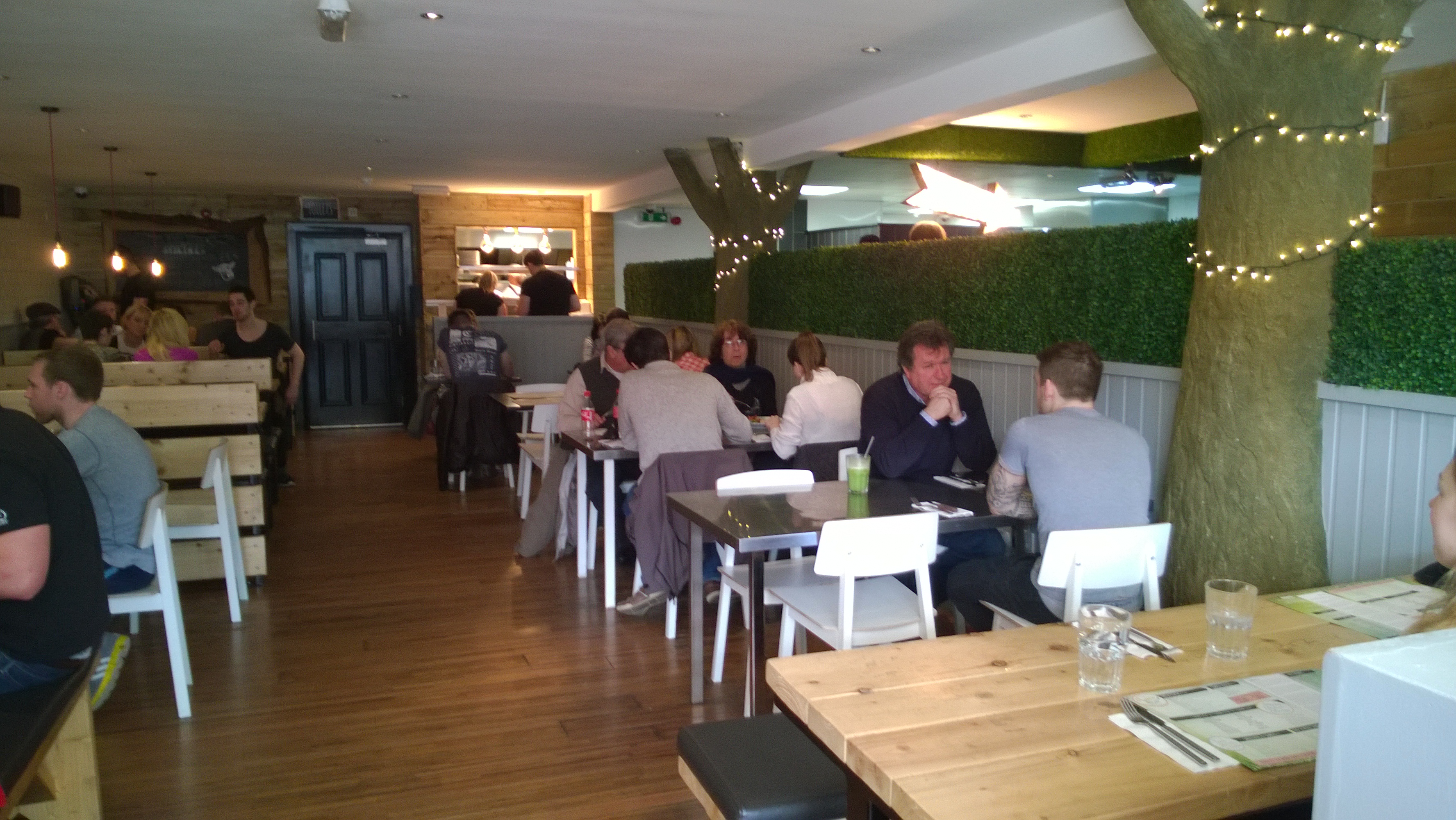 Slim’s Healthy Kitchen (SHK for short) is a novel idea in dining, at least for Belfast it is anyway. The premise is an emphasis on healthy, clean eating, and specifically for people sticking to a particular diet or work out regime.  Based on what your criteria is they have meals galore to suit any palate and requirements. For instance say you’re doing a lot of weight lifting and thus require more protein, they serve a meal that’s high in protein rich foods.  This sounds like the lay man could get left behind though.  Only one way to find out, and that was to try the place for myself –  Being a layman and all.  We visited Slim’s on a Sunday morning for brunch and the place was positively bristling, bikes we lined up against the front and a full size model cow was sat atop the roof.   Inside was a collection of cyclists, couples, families and some people just having a coffee.
