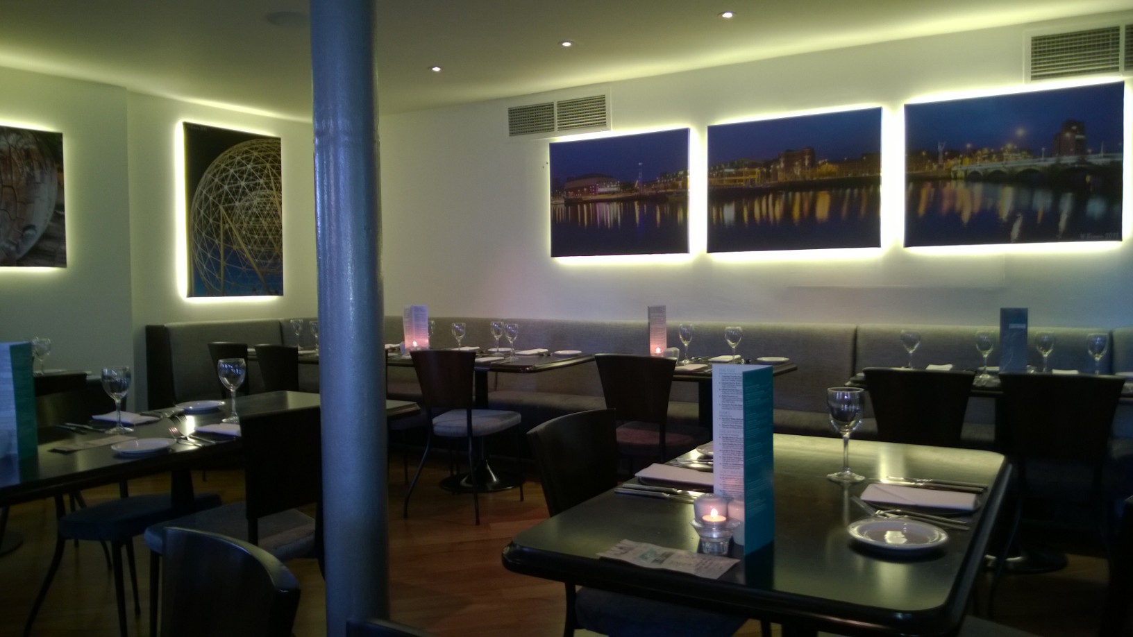 However, after being listed quite recently as one of Joris Minne’s ‘Top 5 Home Grown Restaurants’ (using local produce and home grown talent) I decided it was high time to taste its wares.  The restaurant itself is tastefully decorated in a boutique fashion with dark furnishings against up-lighted walls. Beautiful and stylish pictures of Belfast adorn the walls, it’s semi-formal but makes no pretence of being above its station.