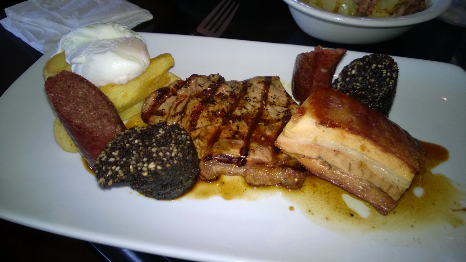 For my main course I had the mixed grill – sausage, Rogers 8oz sirloin, pork belly, black pudding, poached egg, chips, onion rings, cabbage and bacon.  A truly mighty feast but not too much as many a mixed grill can be.  I started with the steak, cooked exactly as ordered and with a wonderful chargrilled taste to the well-seasoned outer.  The black pudding was peppery and crispy on the outside, but not dry on the inside, the sausage very similar.  The pork belly, what I could eat of it, was layered beautifully, crispy skin, melting fat and then succulent, tasty meat – cooking a piece of pork belly is an art and the guys in the kitchen seem to know that.  The chips and onion rings were also very good, but paled in comparison to the meats I had been presented with, and as full as I was I could manage no more than a passing taste of each.