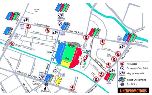 THERE WILL BE A COLOUR CODED TICKET SYSTEM IN OPERATION TO HELP YOU REACH THE CORRECT ENTRY POINT FOR THE CONCERTS. PLEASE NOTE THE TICKET CHECKPOINTS INDICATED ON THE DIAGRAM BELOW. THERE IS NO ACCESS TO DAVIN STAND VIA RUSSELL STREET; ENTRY IS VIA ST. MARGARET’S VENUE OFF NORTH CIRCULAR ROAD.