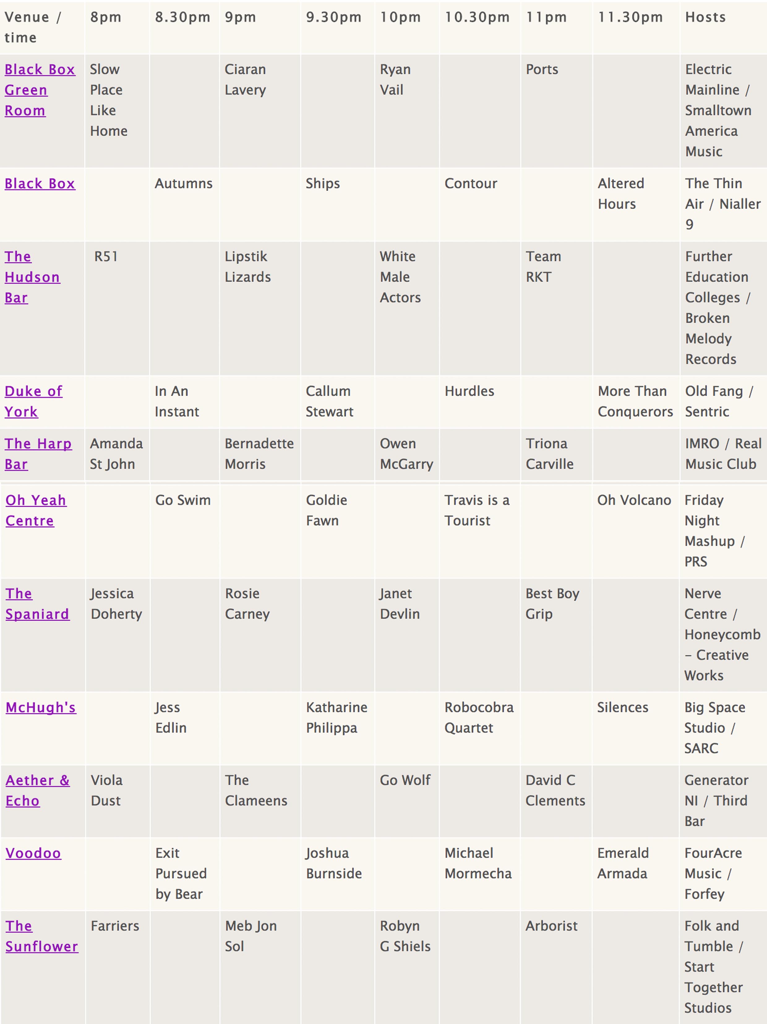 However, it’s not until the evening that the party really starts, with up to 50 bands and artists performing across 12 venues in Belfast’s Cathedral Quarter for absolutely free. The venues include The Black Box, The Hudson, The Sunflower and The Spaniard and you can see everyone from R51, Team RKT and PØRTS, to Janet Devlin, Meb Jon Sol, More Than Conquerors, In An Instant and Emerald Armada. Sounds like a great night of #NIMusic.