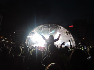 Around 7pm the Square was about a quarter full – with the hard-core fans pushed all the way up to the front, and the more laid-back music-lovers strewn around the middle. The resulting view from the back was merely a sea of arms as Dillon Francis got the crowd onside.