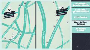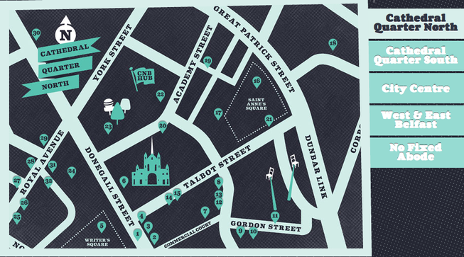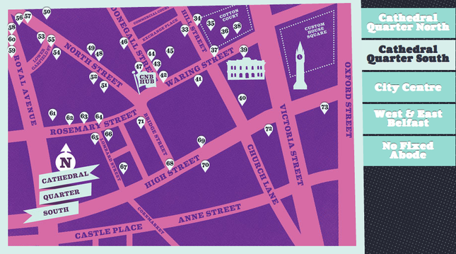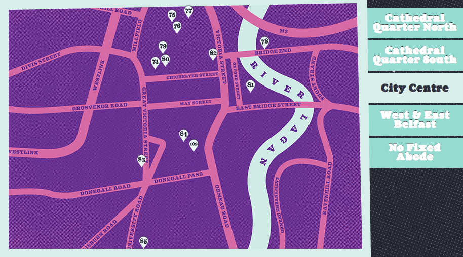 The City Centre saw a number of art and graffiti installations including: No Topless Sunbathing – Belfast Has Suffered Enough (a reinstatement of landmark graffiti of late 20th Century Belfast), Pop Up Gallery by young people from New Lodge, and The What-Ifs (an exhibition of new work by Fiona Nì Mhaoilir).