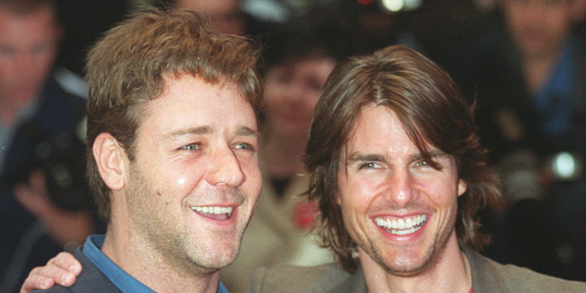 LONDON, UNITED KINGDOM - JULY 4: Movie star Tom Cruise (R) and "Gladiator" lead Russell Crowe arrive for the premiere of Cruise's latest film "Mission Impossible 2" at The Empire, Leicester Square, London, 04 June 2000. The movie has opened to rave reviews in America taking $41 million USD in its opening weekend. (Photo credit should read HUGO PHILPOTT/AFP/Getty Images)