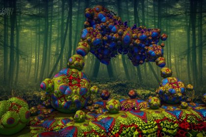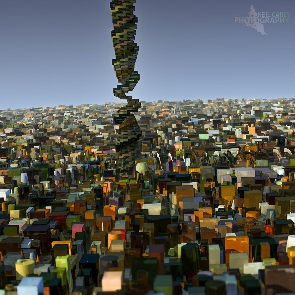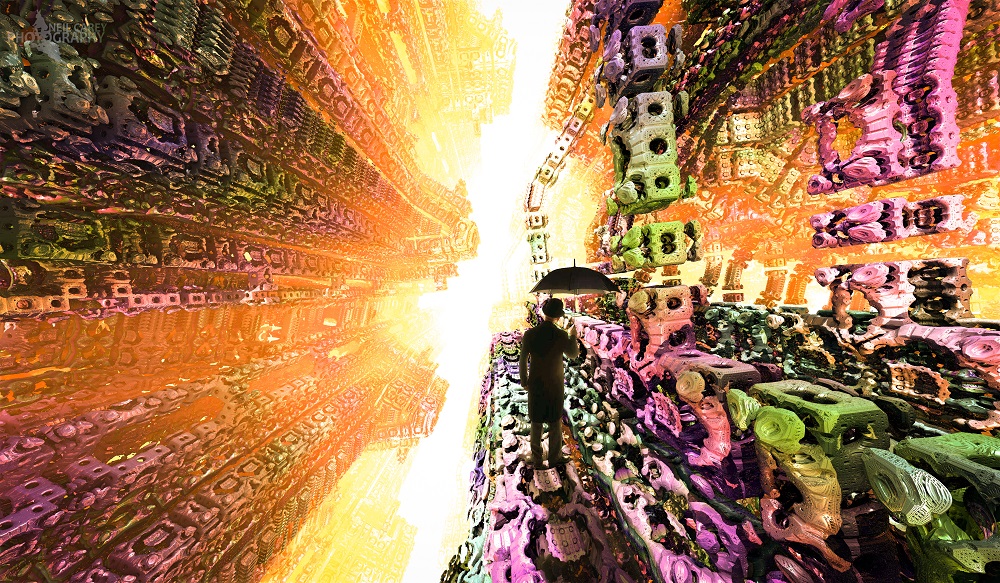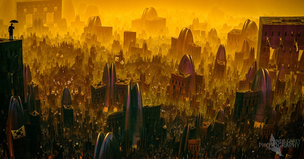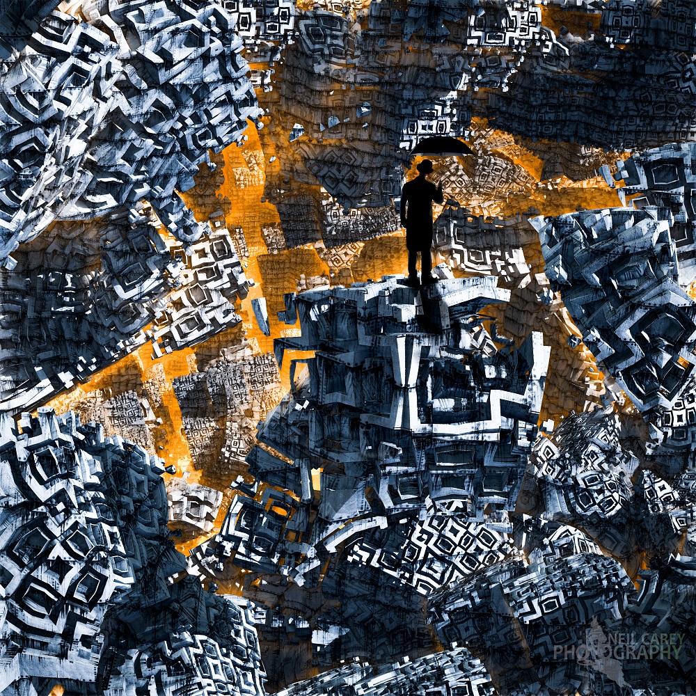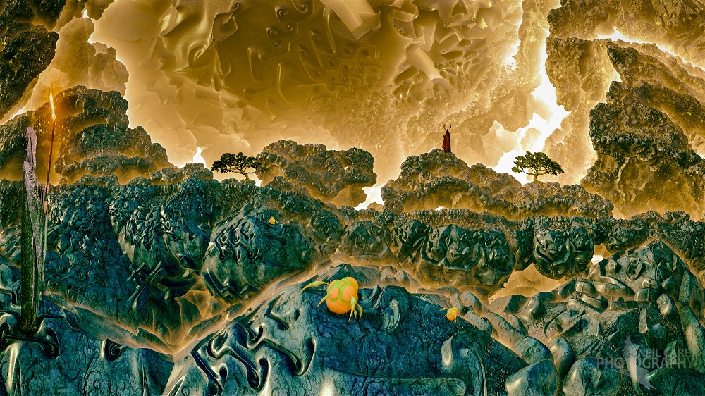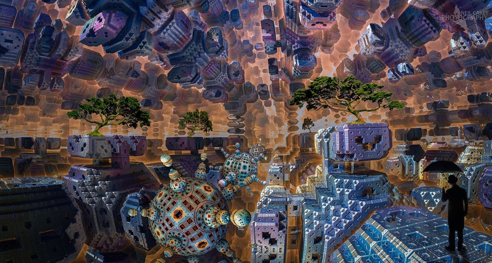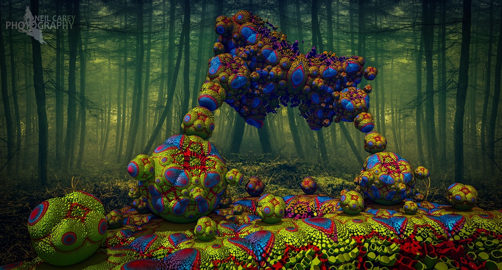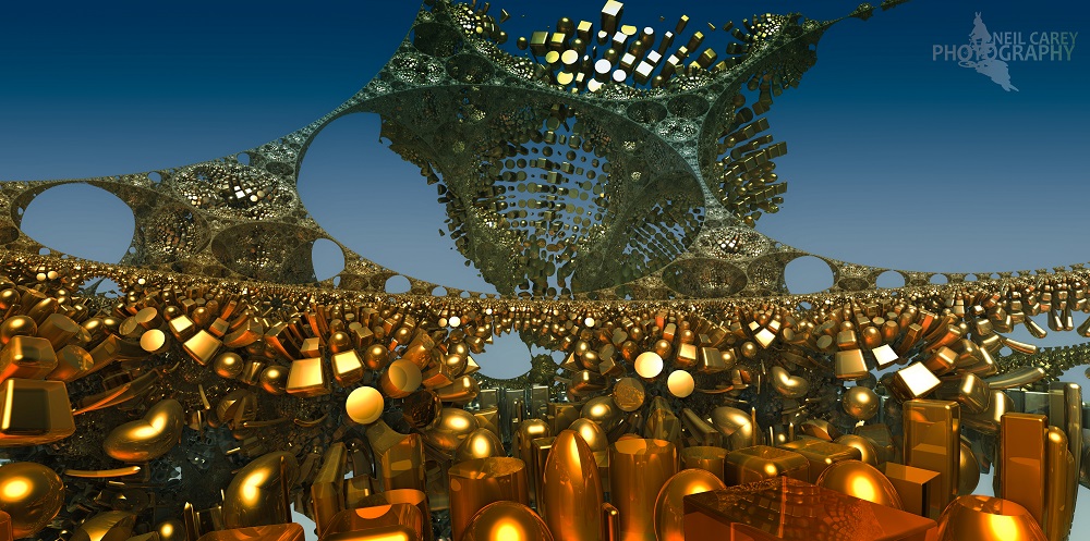 Local artist, Neil Carey works mainly in the field of photography, photographing the beautiful landscapes of Ireland, but he also creates digital art using fractal software called Mandelbulb3d. The diverse images created in this software are based on fractal mathematics, and recently fractals created in this software have been moving into the mainstream, having appeared in movies such as Doctor Strange and Guardians of the Galaxy 2. Neil often adds human elements to his images to create surreal landscapes and scenes evoking thoughts of alien worlds and mysterious secret places.
