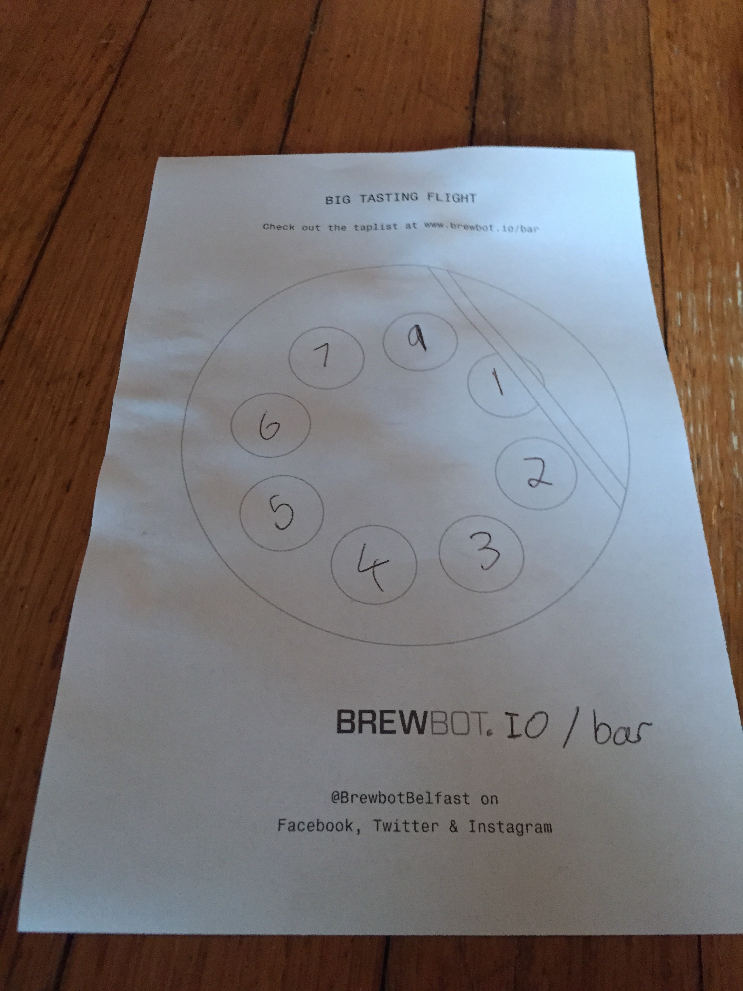 We were there for a Yelp Belfast social event (just an excuse for a few drinks with friends) so when we were all seated down we were brought out a platter of beers – I think they call this a flight. Eight beers are brought out in little brandy-type glasses for you to try. The barman, Blake gave us our key (which helps you keep track of which beer is which) and explained in really good detail what made each one special. He really knew his stuff and was good at explaining the beers to a complete craft beer-novice like myself. You can check out Brewbot’s tap list here. Only one of the beers was brewed by the Brewbot itself, with the others being imported craft beers from other brewerys. The tasting platters are four for £6 or eight for £12.