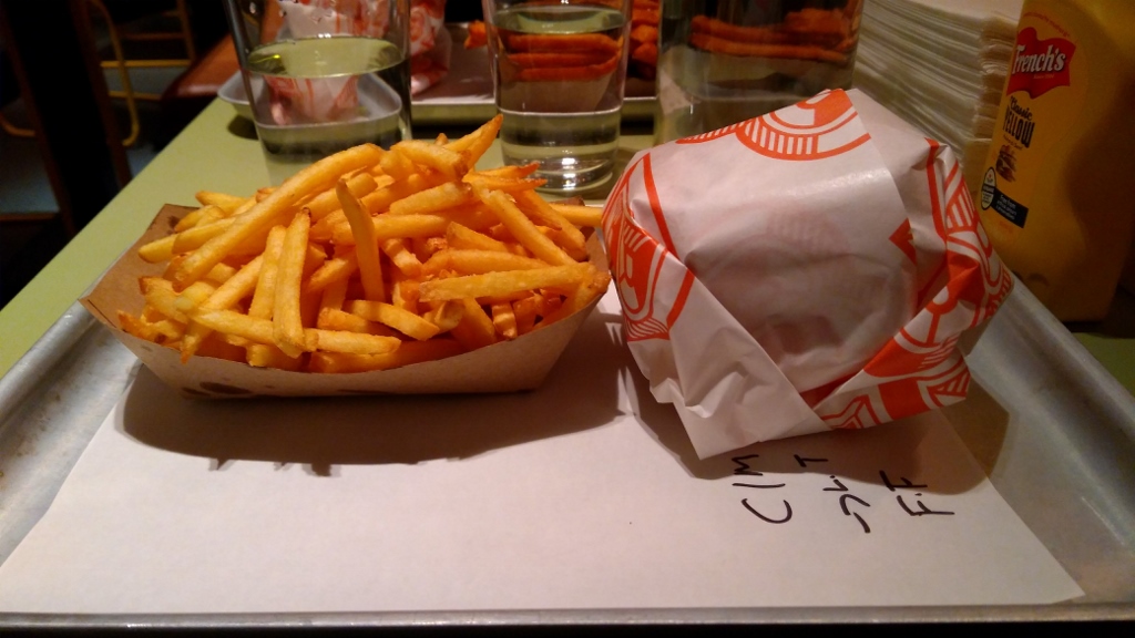 You get served at your table, but it’s cool enough and relaxed enough that you can take your time and feel comfortable in the surroundings. The staff are welcoming and friendly and we are checked on often. The menu is on a business card (it’s certainly small enough to fit on one) and I order the cheeseburger with all the toppings and skinny fries on the side. There’s something wonderfully refreshing in a world of almost unlimited choices to have very little to choose from. I did, however, choose for mine to be cooked medium and am happy to say that that is just how it came. It comes in sturdy disposable packaging wrapped up a bit like a present, with the fries in their cardboard boat alongside.