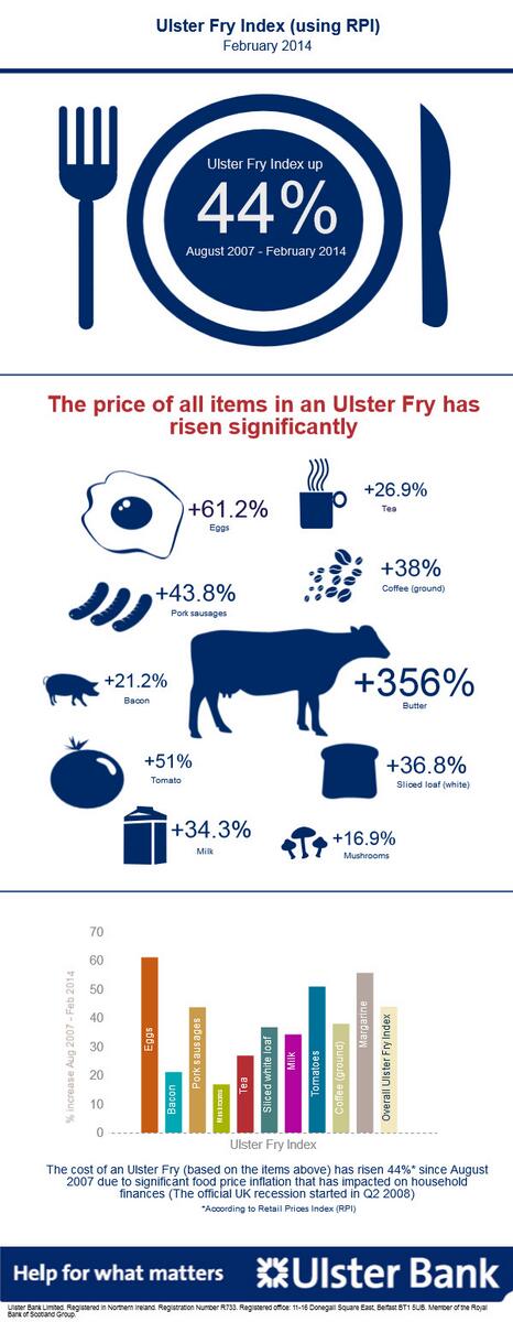 Recently there has been a snazzy wee Infogram being shared around by the Ulster Bank about the rising cost of an Ulster fry, economists have got their knickers in a twist over the fact that it has risen 44% in price since 2007!  The Belfast Telegraph followed this up today with further analysis: