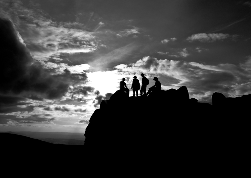 Hikers take a well deserved rest on one of the Tors of Bearnagh mountain, situated in the Mourne mountains in Northern Ireland.