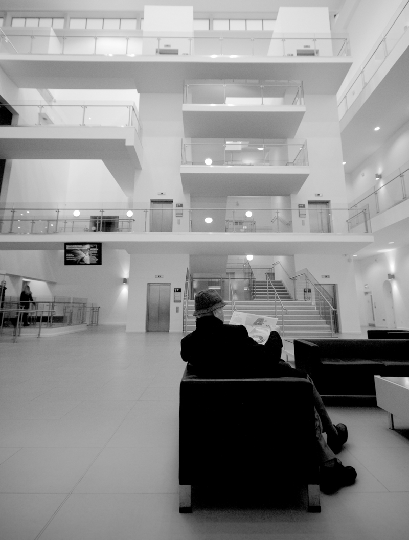 A man reads the newspaper in the wonderfully designed Belfast Museum