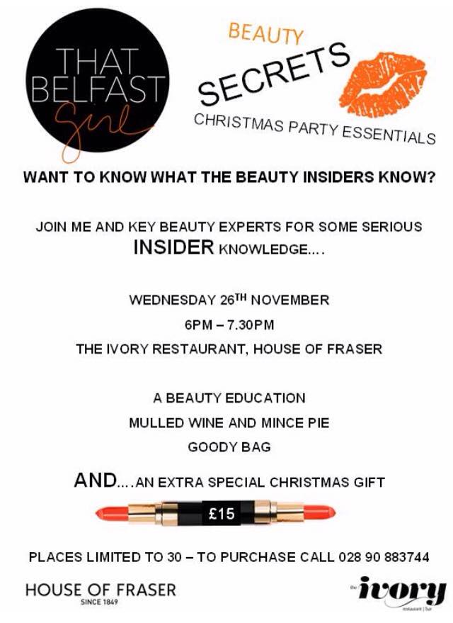 After over a year and a half since its inception, That Belfast Girl is holding her first event at The Ivory Restaurant in House of Fraser on the 26th November. Promising a beauty education, mulled wine, mince pies, a goody bag and an extra special Christmas gift, what more could you want?