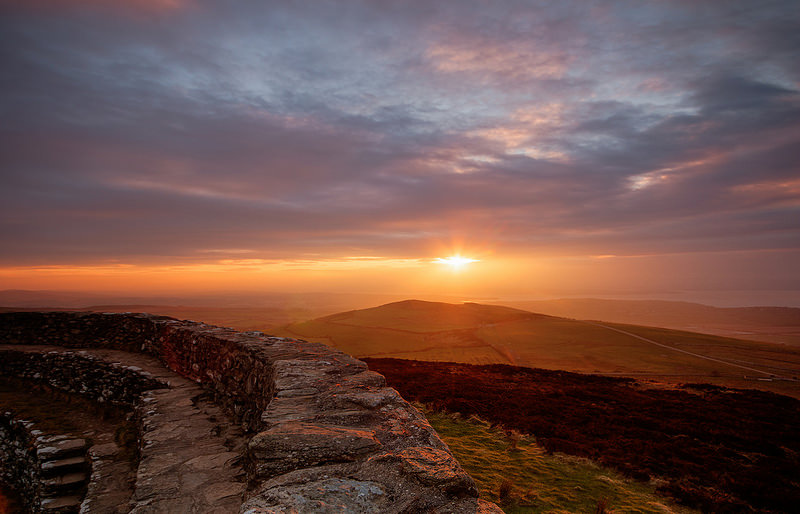 3.Sunset at Grianan of Aileach – The Grianan of Aileach (Irish: Grianán Ailigh, sometimes anglicised Greenan Ely) is a group of historic structures atop a 244 metres (801 ft) hill in County Donegal, Ireland. The main structure is a stone ringfort, thought to have been built by the Uí Néillin the sixth or seventh century, although there is evidence that the site had been in use before the fort was built. It has been identified as the seat of the Kingdom of Ailech and one of the royal sites of Gaelic Ireland. The wall is about 4.5 metres (15 ft) thick and 5 metres (16 ft) high. It has three terraces, which are linked by steps, and two long passages within it. Originally, there would have been buildings inside the ringfort. Just outside it are the remains of a well and a tumulus.