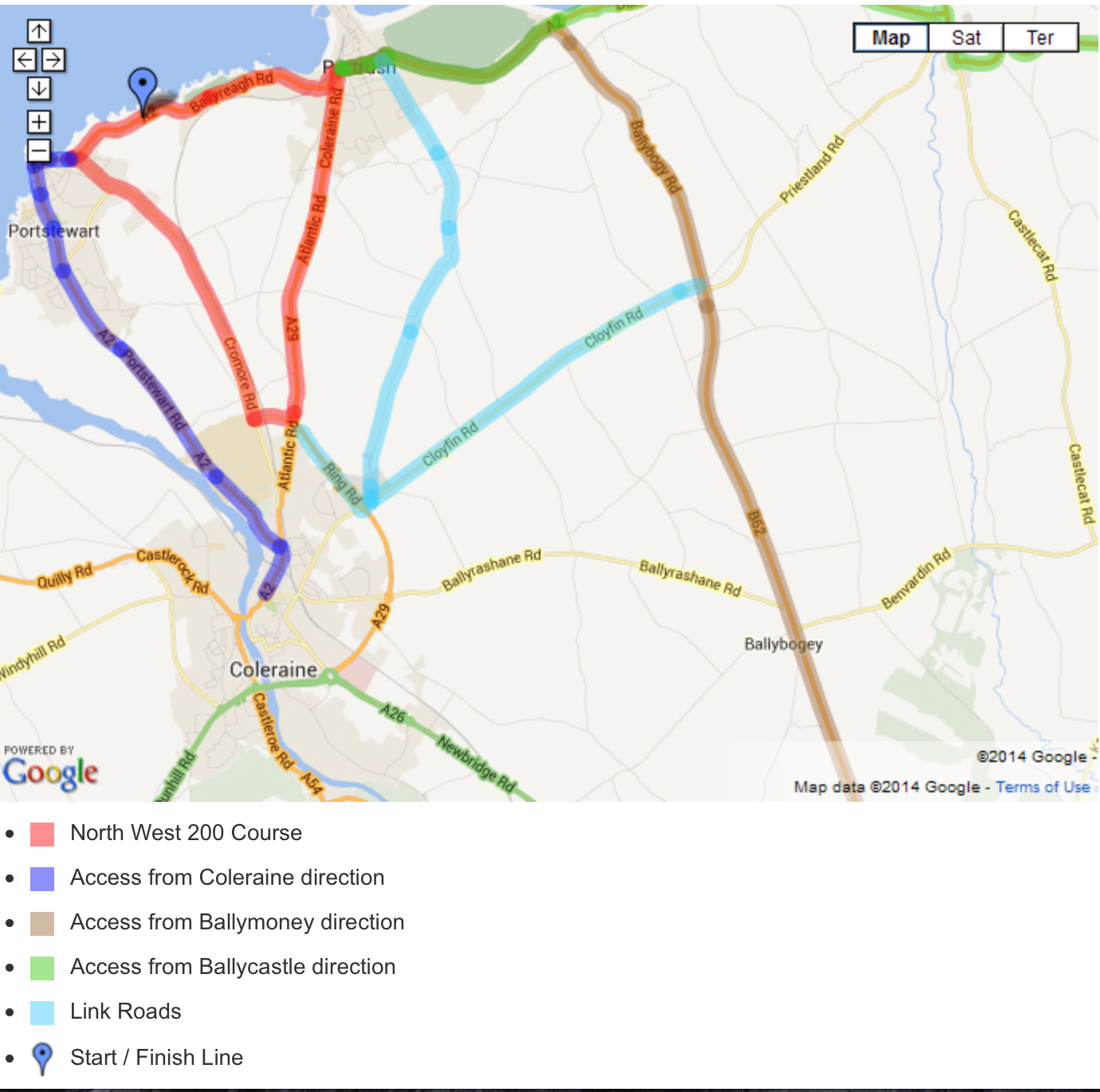 In exceptional circumstances the following changes may take place in line with road closing legislation from 2014. The organisers of the NW200 may in these exceptional circumstances, move a practice or race day, either one day forward or one day back, giving 24 hours notice to the Department of Regional Development, (DRD). This gives the organisers of the event, Coleraine & District Motor Club Ltd, flexibility to allow for extreme weather conditions which may affect racing or practice sessions.