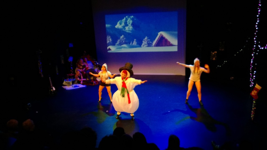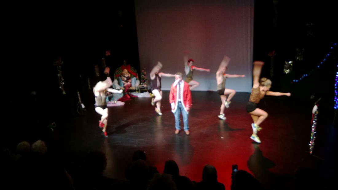 Another Christmas staple in Belfast, and some would argue Belfast theatre’s best kept secret, Pony Dance once again put on their Pony Panto to get us all in the mood for Santa’s arrival. Pony Panto is something which truly has to be seen to be believed, it’s dance, variety, live music, but all with attitude. On stage there’s a VIP chair which is filled by a member of the audience “Cara” and over the night she’s given copious amounts of wine, crackers and cheese and even another couple to sit beside. But more about Cara later. The show is one of 2 half’s and is hosted by the irreverent Miss Leonie Pony. The Pony dancers, Emmen Jude Donnelly and NI street crew Ajendance provide most of the craic with their funny, brave and at times breath taking choreography. Emmen Jude Donnelly put on an amazing dance and aerial display to the sounds of Nine inch Nails but with live guitar and 2 Members of Ajendance put on a clinic with their number “The evolution of music” dancing every conceivable style in the space of 4 minutes.