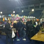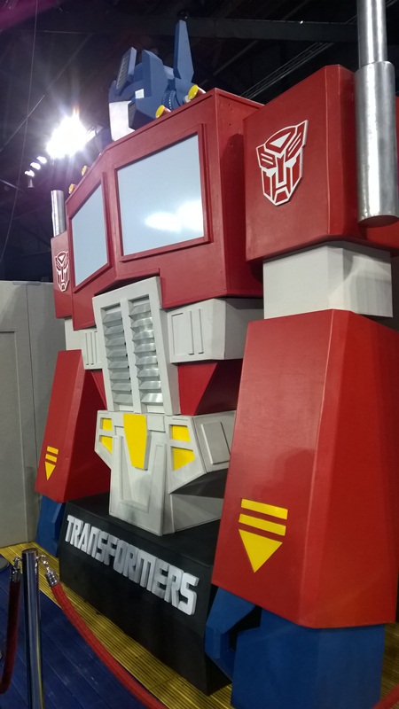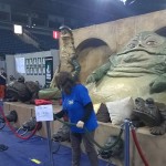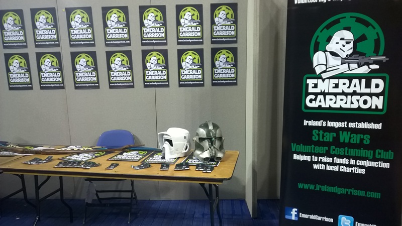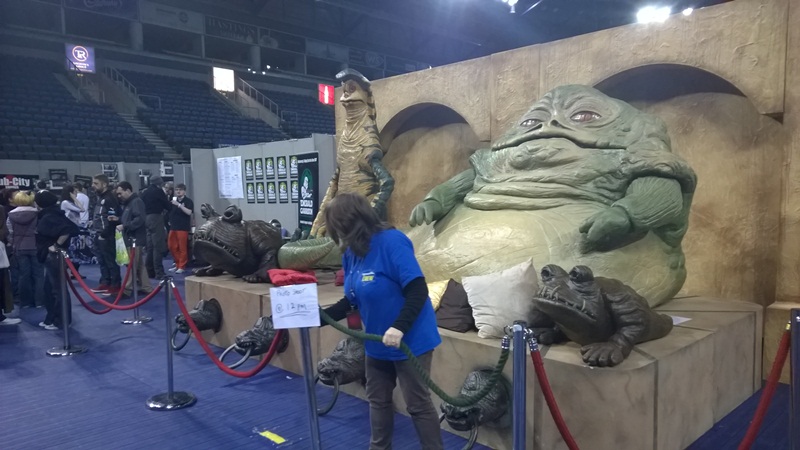 The Belfast Film & Comic Con was held in the Odyssey Arena, a huge space to fill, but fill it they did. Upon entering we were a little unsure of where to go and staff at the immediate entrance to the ‘Ice Rink’ told me that this was the Star Wars section and to head upstairs. Upstairs there was nothing to be seen, but walking down the bleachers and into the main arena we could see a mass of shops. There was a huge Jabba the Hut scene recreation of his lair and a full size Optimus Prime by the excellent Emerald Garrison, who also had their guys in full professional quality costumes wandering around to take photos with.