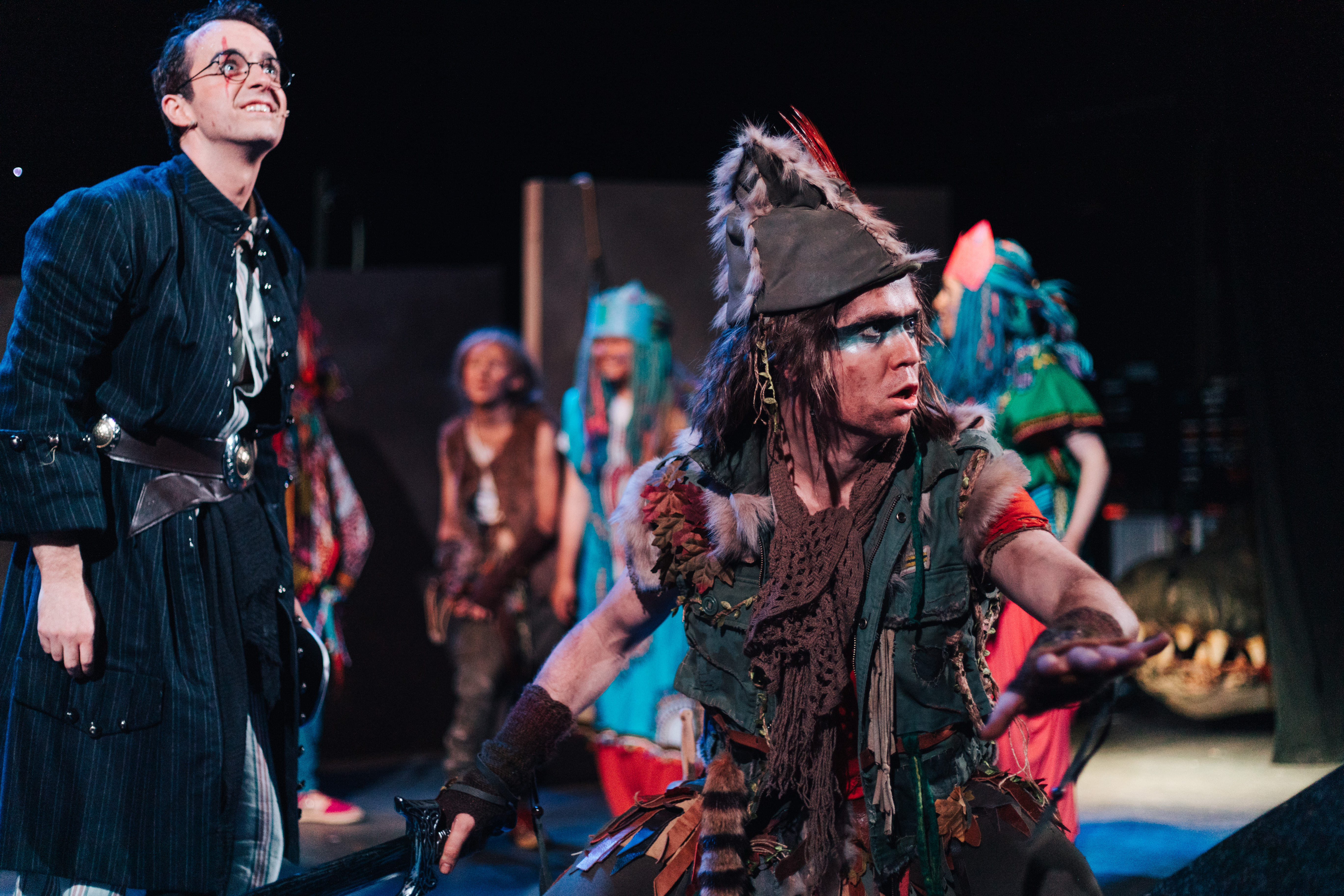 Musically, the songs are really catchy if a little ballady when there’s no dancing to accompany them, and there’s a sort of anarchistic, apocalyptic feel to the music which is mirrored in the costuming and unruliness of the group of Lost Boys (played by a top class young ensemble cast). Tiger Lily, played by Colette Lennon Dougal and her father Great Big Little Panther, played by Alan Richardson sing a Moana-esque song from the balcony seats which was my personal favourite and I’m not too proud to admit that I’ve found myself humming it since.