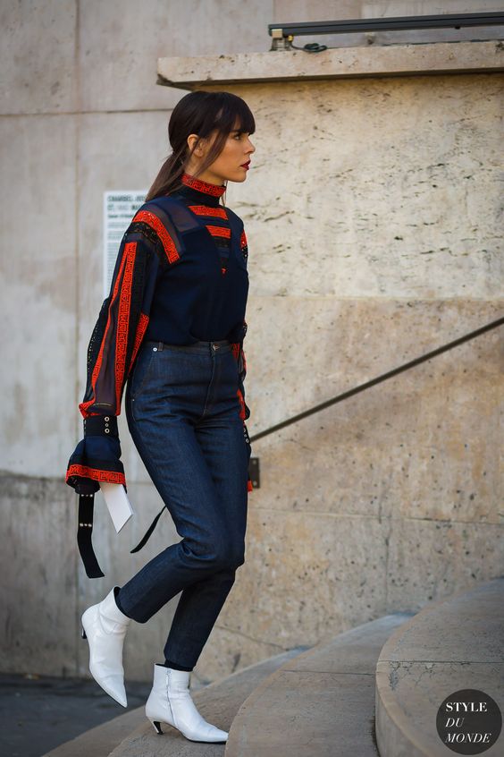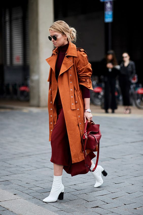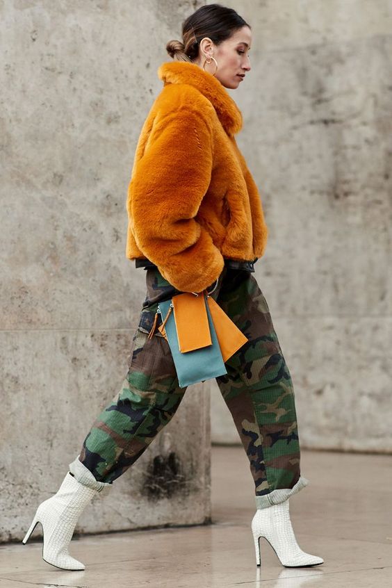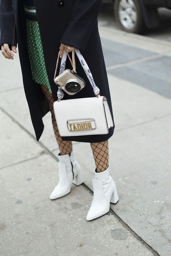 However, if you’re wearing a predominantly black outfit – be wary of white boots looking a bit stark or harsh on the eye. Although this would be one of the most effective ways to make the boots stand out, you could update a plain monochromatic look by introducing a zebra print bum bag to integrate the white in a different, more interesting way. Another option would be to simply colour-block with a red clutch bag.