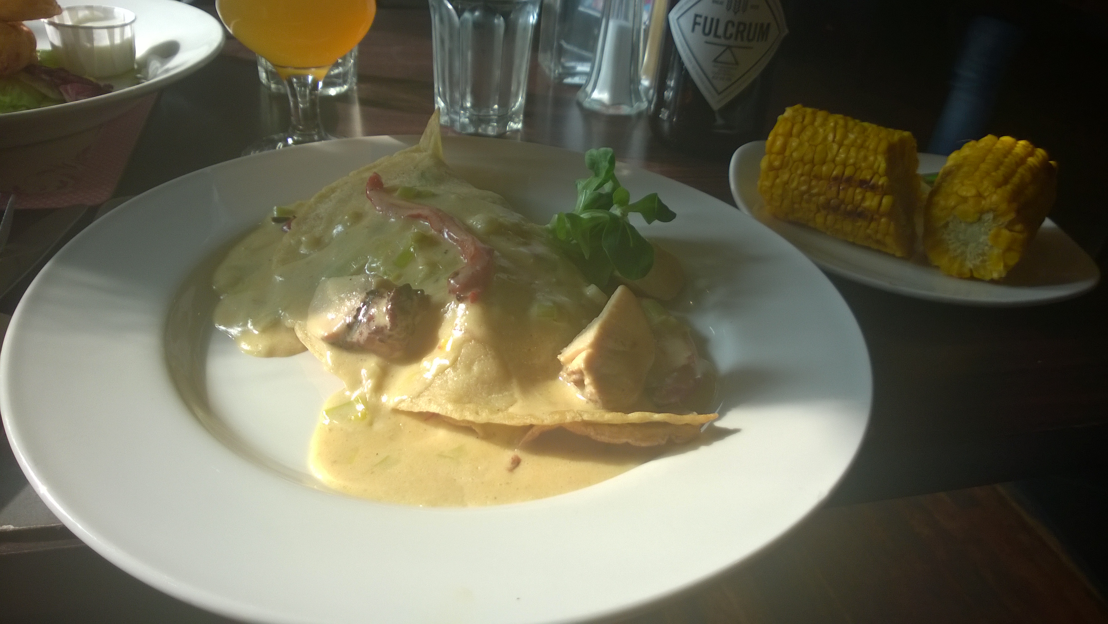 Our main course came in the form of smoked chicken with peppers and onions in a white wine and leek sauce served with Boxty. Boxty seems to be like a crepe made out of potato, it’s popping up everywhere and, if this is anything to go by, for very good reason. The boxty was light and well-seasoned, the chicken had a great smoky flavour that worked well with an almost chowder like white wine sauce. I have to say that this isn’t what I would typically go for in a restaurant, but I was glad I did as it really was delicious. I had a side of corn from the grill too which was sweet and tender with a nice taste from the way it was cooked.