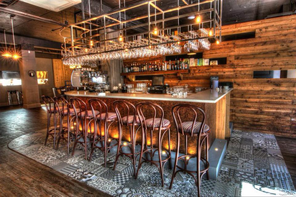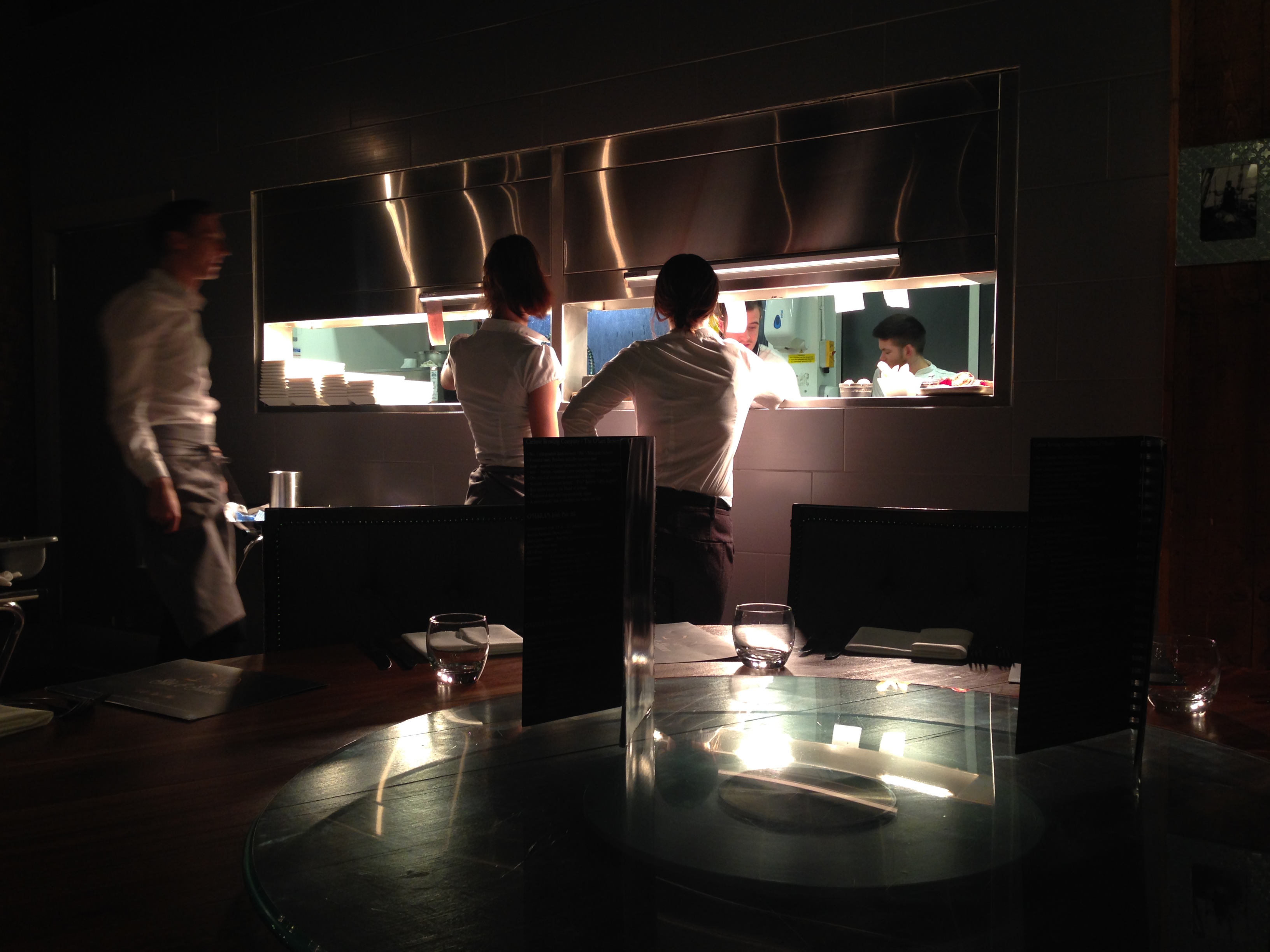 The decor is modern. It’s simple, without being boring – wooden walls, wooden floors, with lots of wide open spaces and interesting bits and pieces on the walls to look at. There’s not a lot of soft furnishings, but it works. As we’re in quite a large group we get seated at a lovely big round table right by the kitchen, so we can see the pass easily, which is a nice addition to the night.
