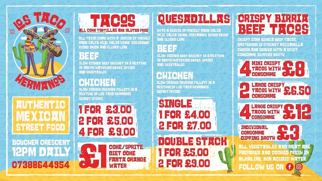 Offering ‘Authentic Mexican Street Food’, Los Tacos Hermanos serves tacos, tostadas, taquitos and quesadillas, amongst other things, all made with the freshest of ingredients. You can choose from Mexican chicken or beef, and your tacos can be soft or crispy.