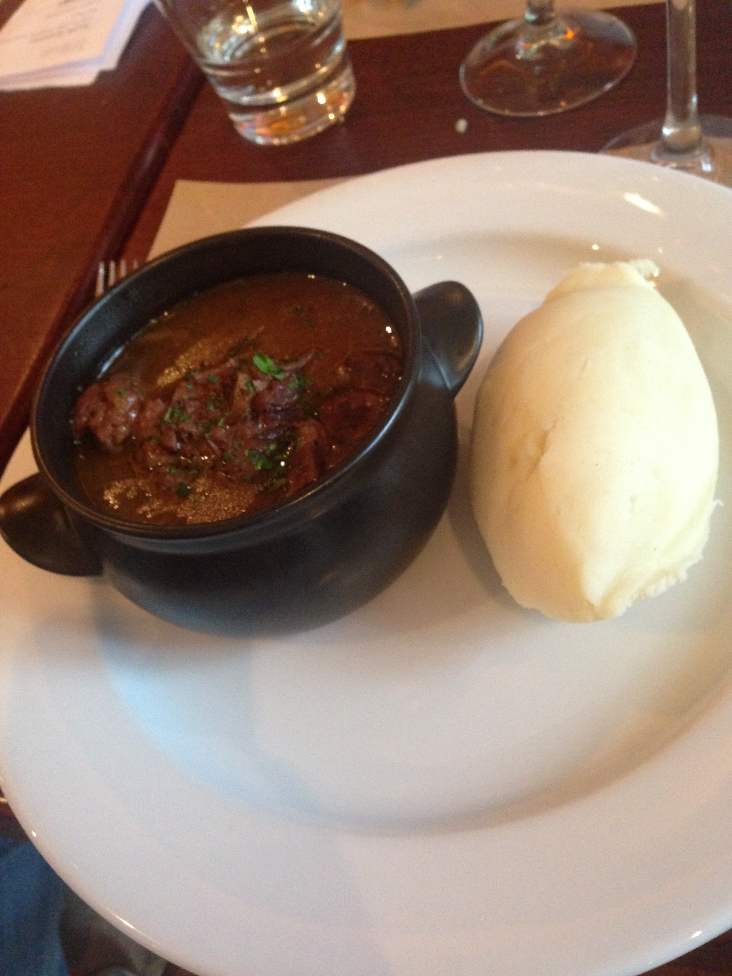 IMG_3181For main course, the filet (fillet steak served with potato and bacon roulade, onion soubise and mushroom duxelle). Now I’m not exactly sure what a soubise or a duxelle are, but I can tell you that they are delicious. The fillet was a massive hunk of meat that was cooked to order and is honestly one of the best steaks I’ve had in a long long time, perfectly complimented by the mushroom and the potato which  were equally as good.