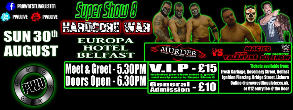 Pro-Wrestling Ulster have been keeping busy recently, firstly current PWU Champ Al Snow’s return to Super Show 8 has been announced as a participant in HARDCORE WAR! The Murder will take on Magico, Luther Valentine and Al Snow in a 3 on 3 no holds barred brawl that will leave the Europa Hotel a shell of what it once was. Tickets here