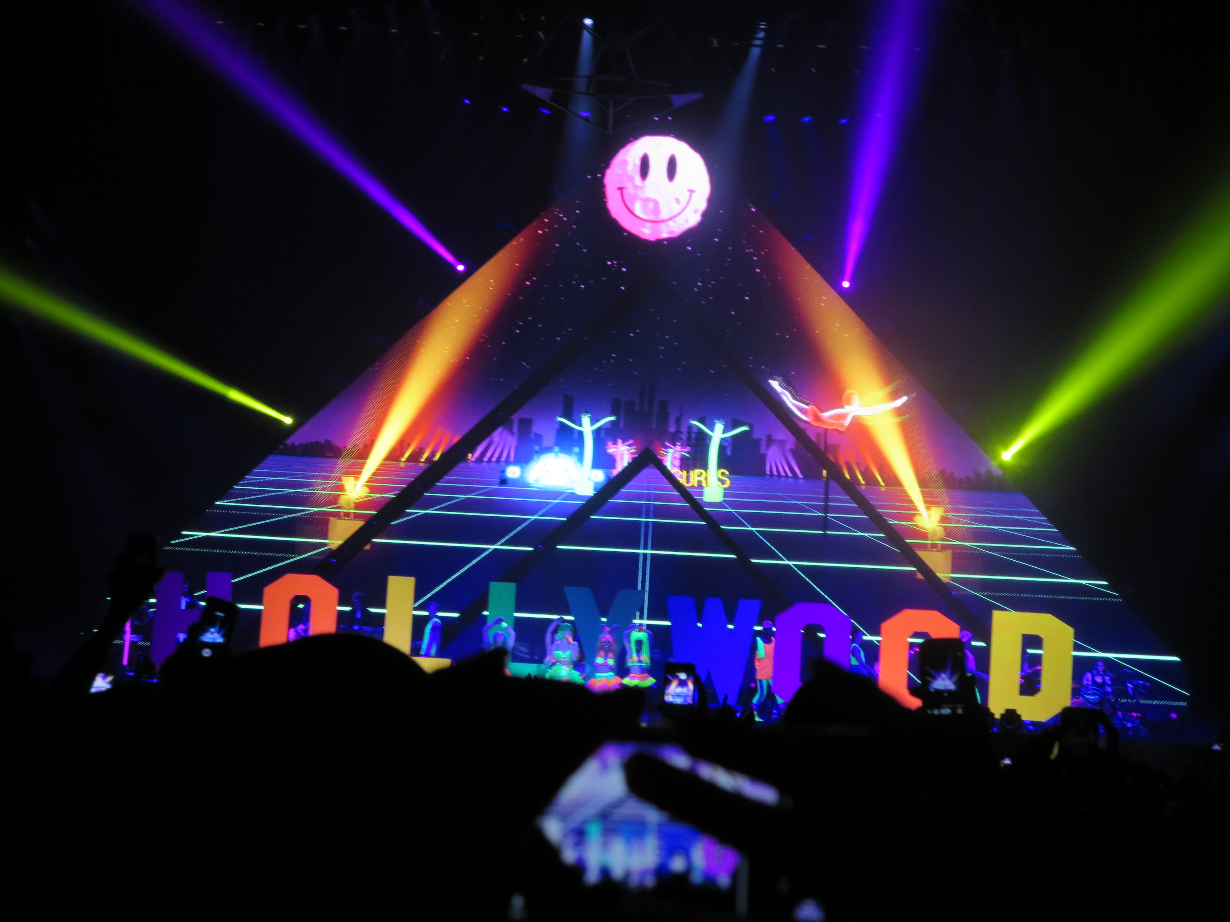 As the show draws to a close there’s a big old Megamix Dance Party in the Throwback section with all the 90s tunes playing that you could ever want followed by giant floating tacos, champagne and lipstick which go out into the crowd for This Is How We Do. Then there’s the Hyper Neon section complete with newest single Birthday were she gets a fan up on stage to celebrate their birthday before mounting a harness attached to balloons so she can float around above the crowd.