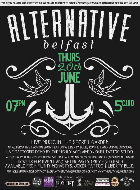 Gig of the week is still going strong, I’m trying the alternative “Pick of the week”  as a title. What do you think of that? I’m leaning towards either that or “Weekly happening?”.  Let me know in the comments below sure. This weeks pick of the week is a mixed bag, but sounds like a great night out.  Alternative Belfast is an Event being put on by The Filthy Quarter and Joker Tattoo and celebrates the alternative side of Belfast.  We’ll say nothing about the fact they’ve a Derry band playing then…ahem… There’s a Bacardi and Jack Daniels drinks reception and on the night Wyldling are playing an Acoustic set to take care of the music side of things. Then throughout the night there’s Live tattooing by Joker Tattoo and An alternative fashion Show; Liberty Blue, Iron Fist and Sophine Dinsmore will all be displaying their wares.  There’s an after party too in the Gypsy Lounge should you wish to continue partying hard (as Andrew WK would say).
