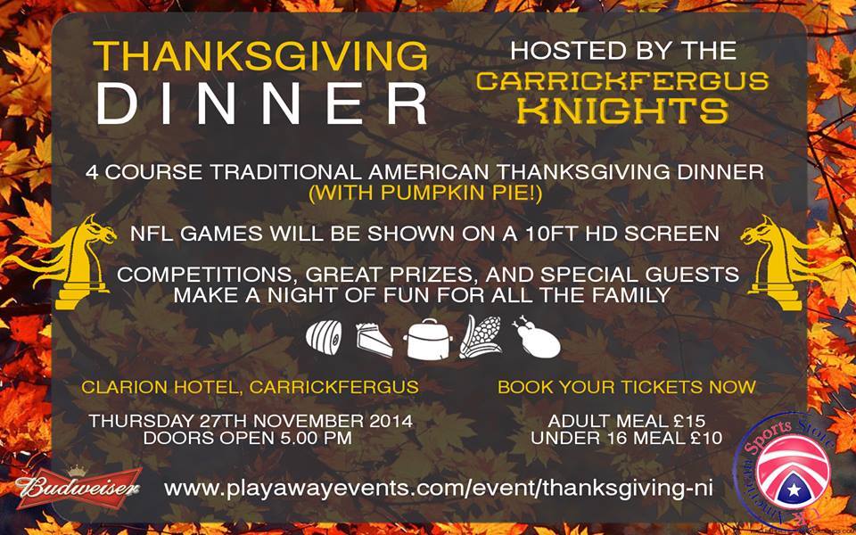 The leaves are falling from the trees, the days are getting shorter and the scarves and hats are coming out (did they ever really go away?). That can only mean one thing…it’s Autumn. However, if you’re from America, thoughts of Thanksgiving and delicious turkey won’t be far off either. Although this is a purely American holiday, it only seems right that the Carrickfergus Knights American Football team along with the support of the Belfast Trojans are holding a Thanksgiving extravaganza to celebrate.