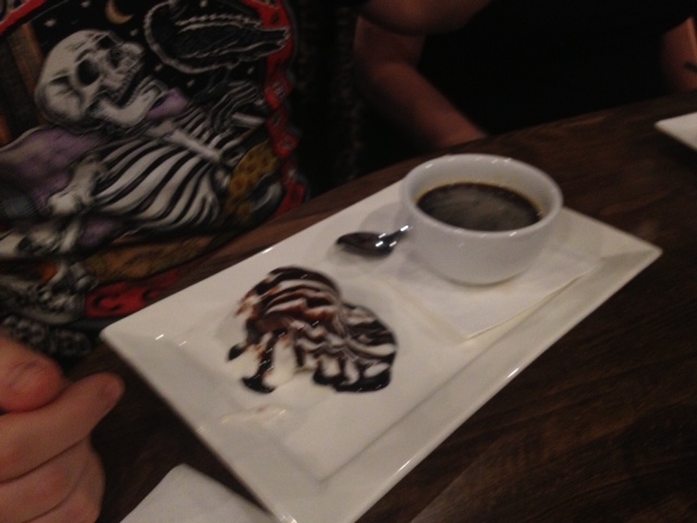 Helpfully for their pastas they offer the option of having 2 smaller sized portions of your choice incase you can’t decide which one you want. Although not adventurous I chose Spaghetti Carbonara and Spaghetti Bolognaise. I found the Bolognaise pleasing but a tad bland, although others on my group that tried it enjoyed it thoroughly. The carbonara however is probably the nicest I’ve ever tasted. Silky with a smokey creamy taste. To finish off they offer a mini deserts range, which is a small desert and a hot drink. I had the profiterole which was filled with chocolate cream and drizzled in liquid chocolate, it was light, airy and a great finish to the meal. I had a coffee as well and with that it was done.