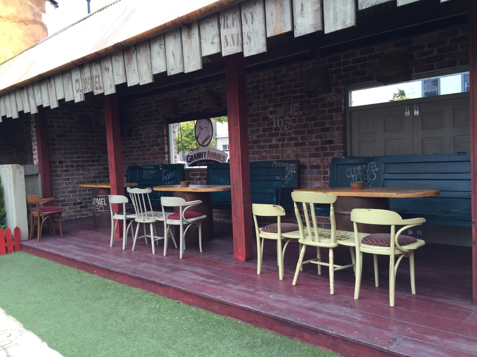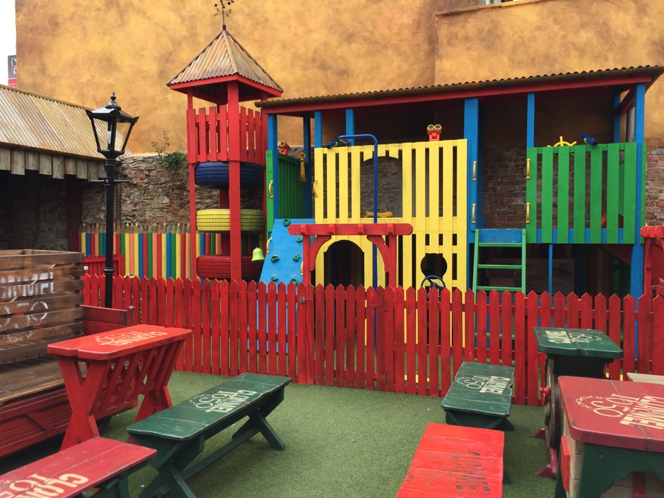 A trip outside to the beer-garden sees a full size tractor as the centrepiece, alongside a brightly coloured play park for kids, a lovely covered area for summer drinking (we are in NI after all) and a faux outhouse complete with feet hanging out the bottom.