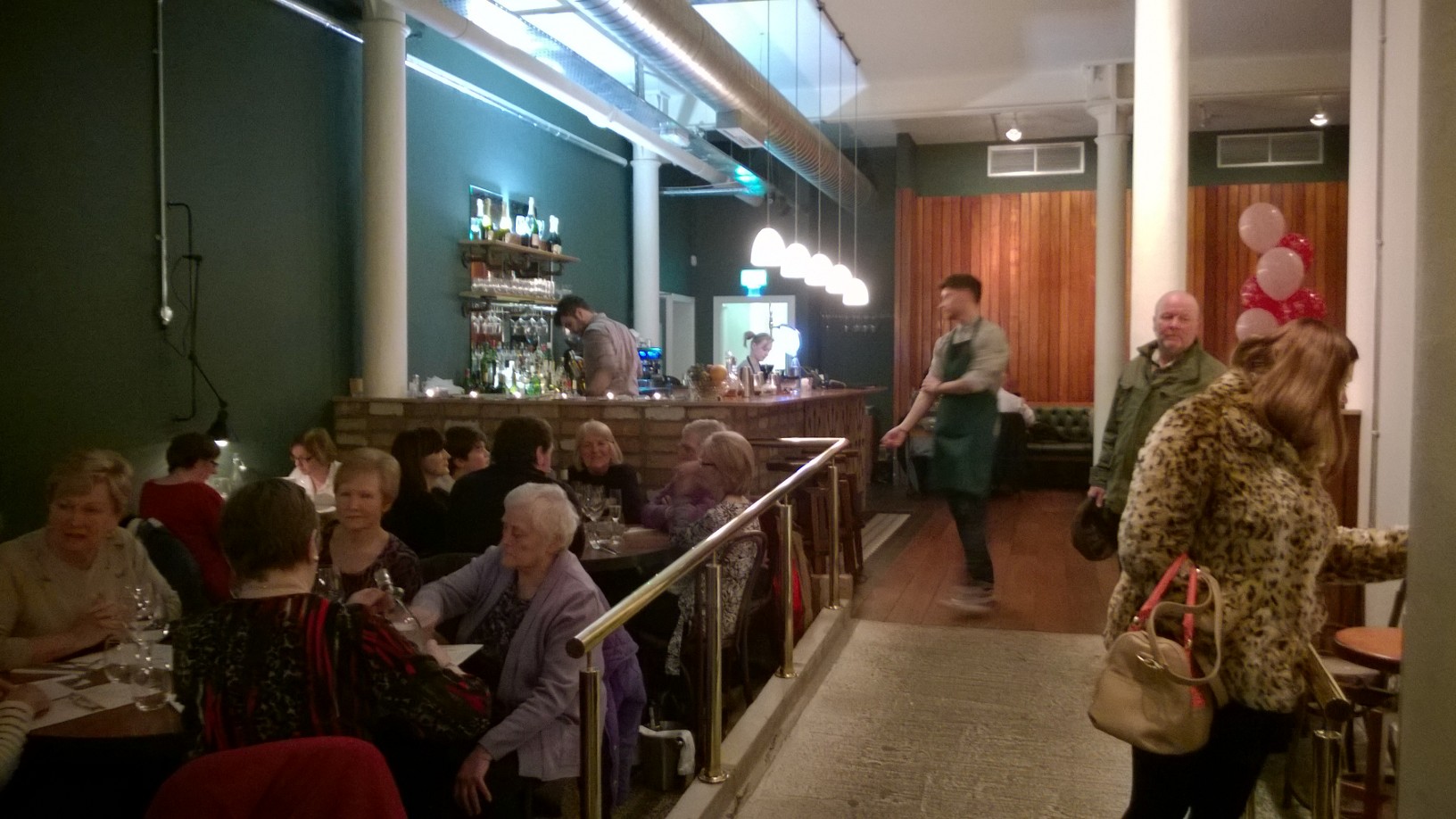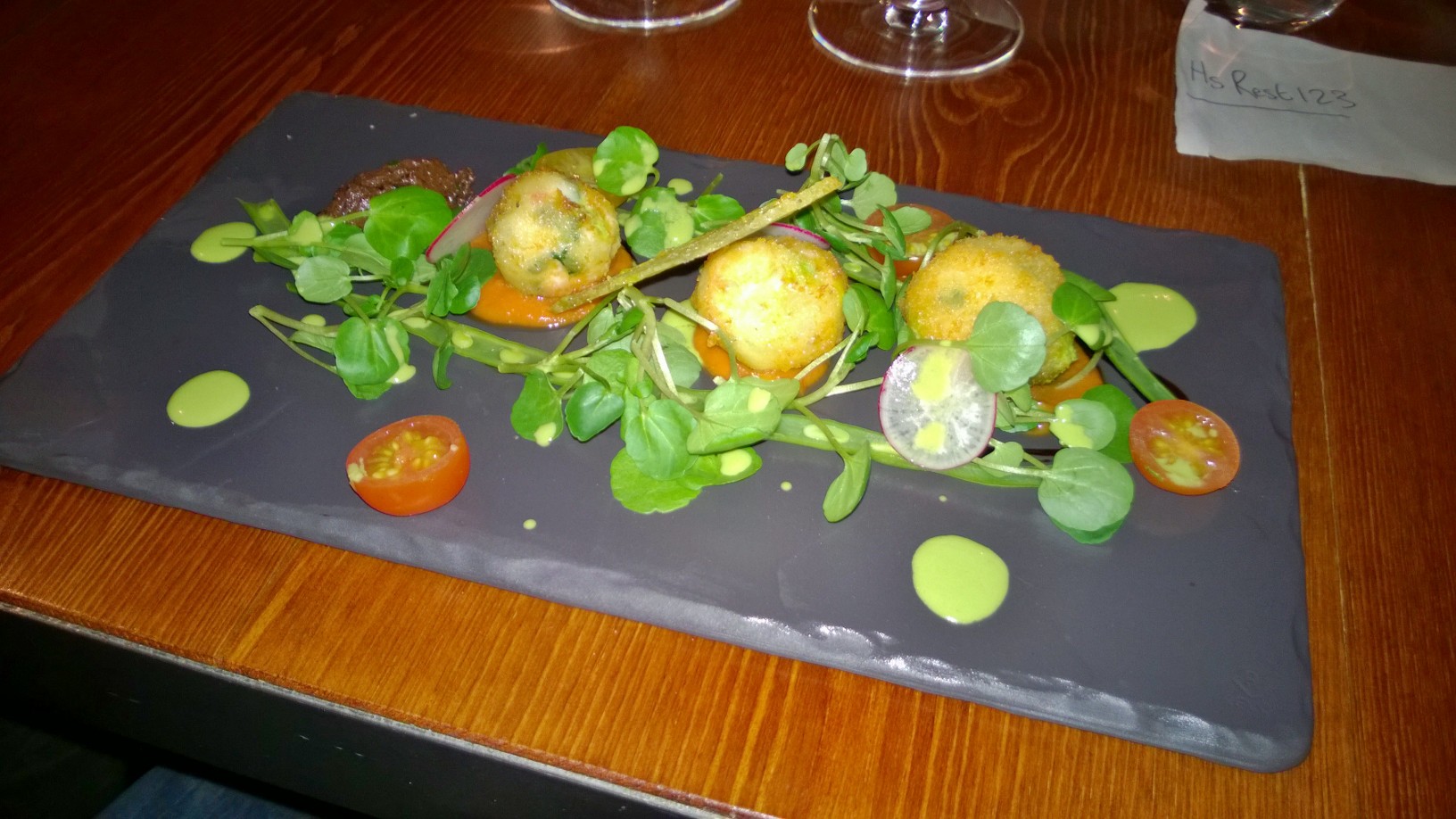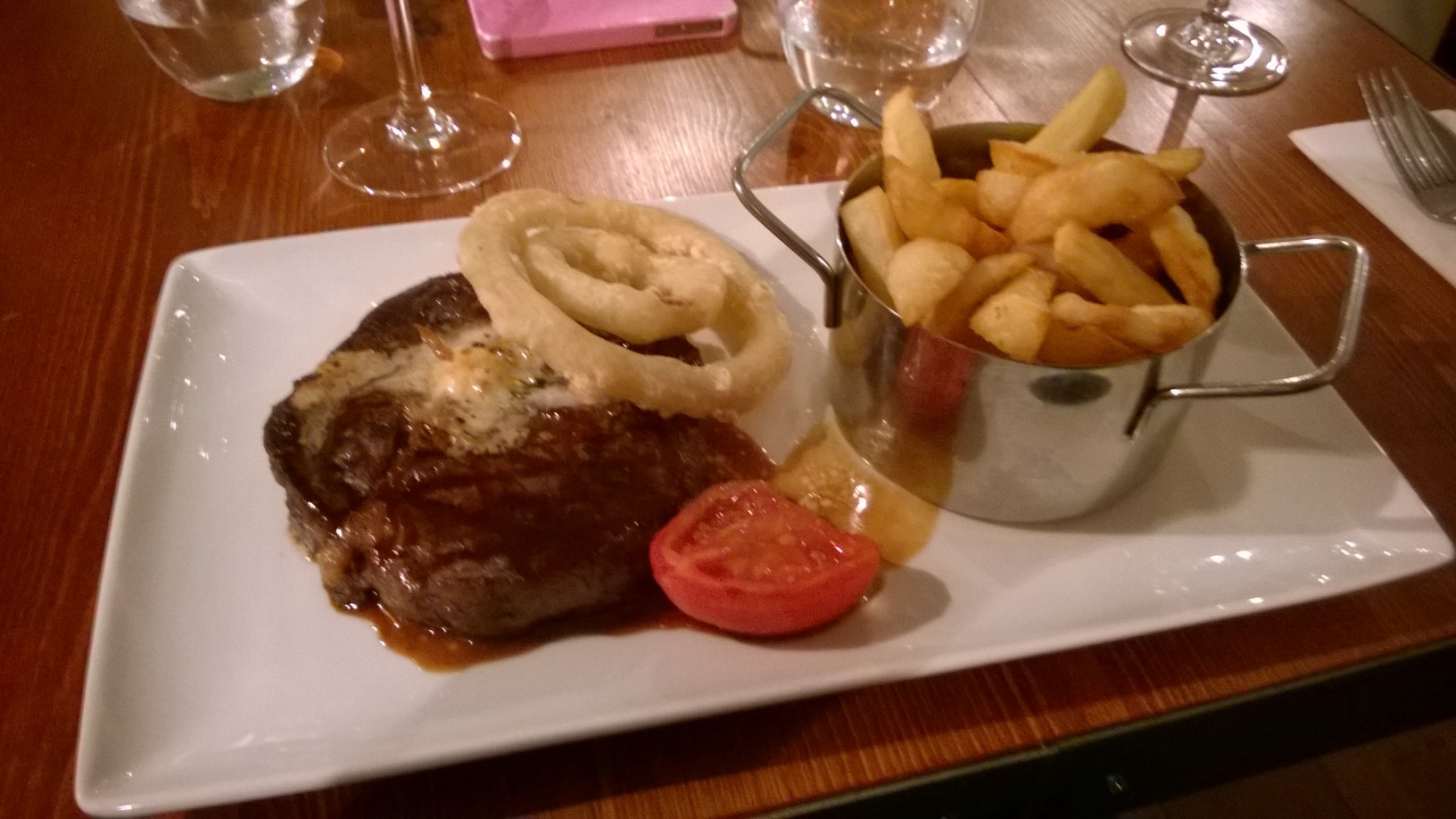 We were seated near the back in a well lit area and were tended to very well by our 2 servers. They were both knowledgeable about their specials and the food in general, which is hard to find these days. For example, I was enquiring about the steak as I had the pre-theatre menu (we were as it happened on our way to the theatre, so it seemed rude not to) which was £15.95 for 2 courses with a £5 supplement if you wanted steak. I wanted steak, so I paid it. I had a goat’s cheese fritter for starter that was delicious, the cheese was lemony and light as was the breadcrumbs coating it, the tapenade accompanying it was just that – a great accompaniment. Next came the steak, locally sourced and cooked to perfection (as was promised) a wonderful meaty seared outer gave way to a pink but warm centre. It was topped with some kind of buttery sauce and the onion rings made of whole onion and crispy chips made for one of the best steak meals I’ve had in a long while.