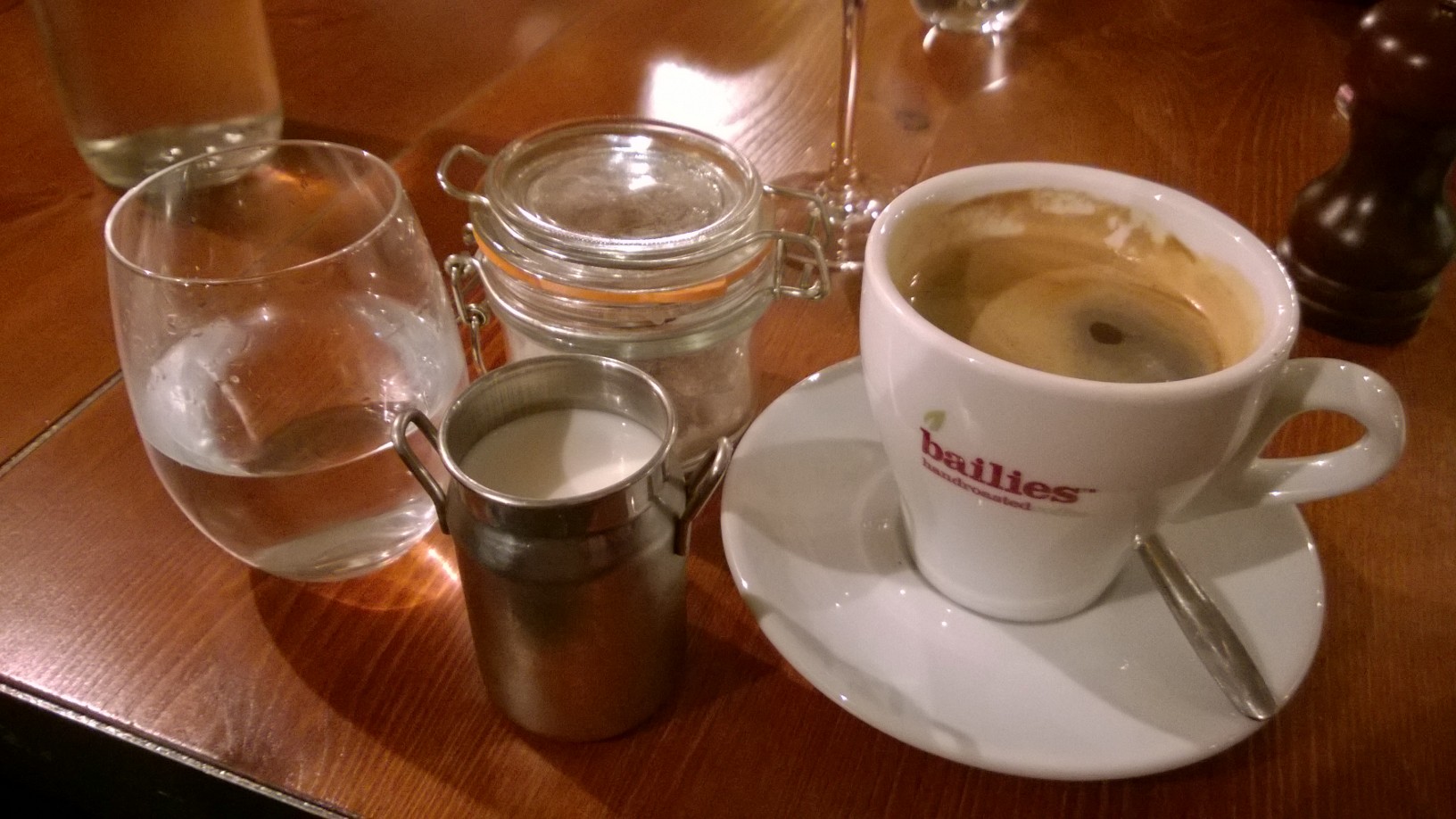 Throughout the meal the water bottle on the table was replaced numerous times – without asking – the staff were attentive without being pushy and it definitely seemed like there were more than the 3 servers in the restaurant with the speed with which they were getting about. I finished off my meal with a coffee, which was of the Bailies brand, a brand I’ve seen popping up in a few places and a blend that I really like. The coffee came out quick and the presentation was great, a wee milk urn used for the milk being a nice touch.