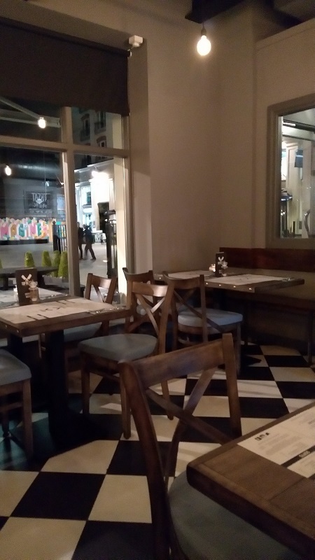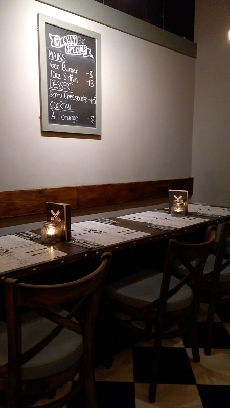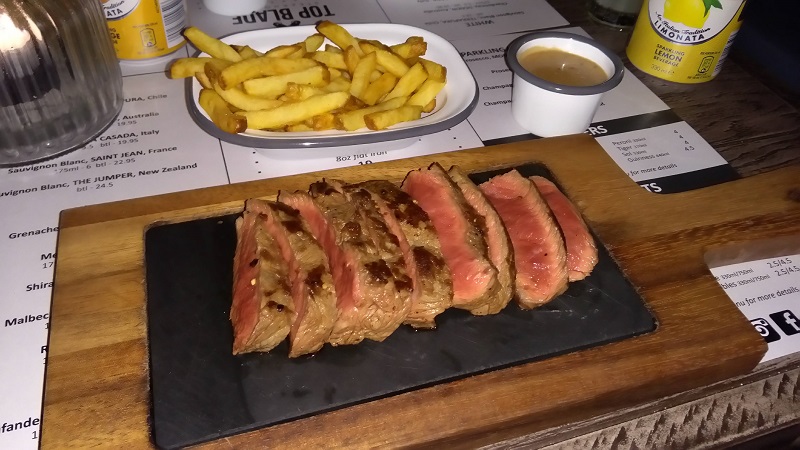 Top Blade’ is situated in the St Annes square in the spot previously held by Chopin and with Buba, House of Zen and Pizza Express all within spitting distance it’s not without competition. The décor is fantastic, a black and white check floor with muted wooden tables and chairs are complemented with soft lighting and a soft seating area directly as you walk in. It all makes for a situation that seems intimate for a date, but accessible for a larger party. As soon as we entered we were greeted warmly and seated right away, our waiter advised that the steak was best-done no more than medium or it would be tough. Sage words indeed. A full wine and drinks menu awaits, but as this was during dry January lemon Pellegrino’s where opted for instead. The menu is slightly curious because it is pretty much one thing. A £10 flat iron steak, you can order the usual sides (chips, sweet potato fries, veg etc) and sauces but lest you take the veggie option or one of the specials – a sirloin steak or a burger -then steak it was. Heading the advice of the server we both ordered our steaks medium rare (I usually go medium). My steak came and presentation was brilliant with skin on fries served in an enamel bowl and pepper sauce the same. The steak came already cut up on a slate, that made my teeth cold every time my cutlery touched it, like fingers down a blackboard. The skin on fries and pepper sauce were excellent – the fries with crunchy with golden outers and soft fluffy inners, the pepper sauce a touch spicy and earthy with a great pepper taste. The steak however I was not a fan of, the seared outer had a reasonable taste and texture but once cut and put in my mouth I found myself just endlessly chewing it, and chewing it and chewing it. I gave up half way through and just finished off my fries dipped in the pepper sauce. The bill came in at a very reasonable price of under £20 per head, however, it couldn’t make up for my disappointment in the steak.