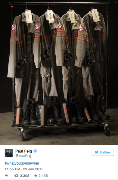While we’re on the subject of Kristen Wiig (why does she need 3 ‘I’s in her name?), Paul Feig has posted a picture on twitter of the costumes for the new Ghostbusters. It’s not much but we can at least see that they’re not spangly or pink or souped up futuristic girlie jump suits. Kristen Wiig is one of the 4 new busters along with Melissa McCartney, Kate McKinnon and Leslie Jones.