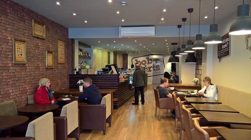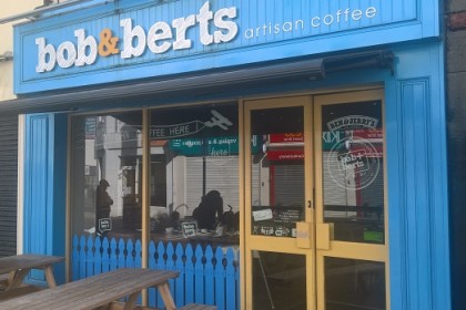 It’s Easter Monday and I’m looking for a coffee and a bite to eat in Coleraine. It’s as dead as a Dodo, but as every other shop was seemingly closed I see a shiny beacon of blue and yellow out of the corener of my eye that is Bob & Berts Artisan Coffee! Yaaayyyyy!