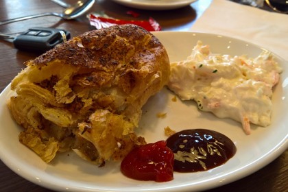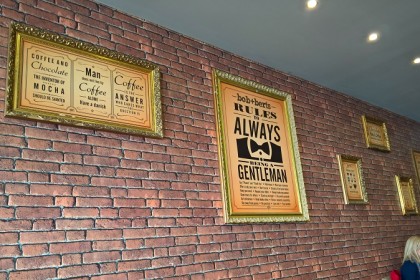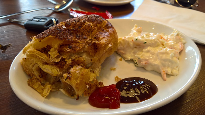 I ordered a flat white and a spicy home-made sausage roll with coleslaw and then made my way to the built in Belfast sink to get myself some refreshing water. The presentation, like the surroundings, was excellent with the flat white coming in a fancy wee glass and finished on top with the wee fig leaf that clever baristas tend to do, like a tee-totalers version of a shamrock in the Guinness. The sausage roll was delicious and spicy with flecks of pepper visible throughout and a spicy topping. It was crispy and surprisingly filling, the slightly sweet and cooling coleslaw a really good food buddy to accompany his spicy friend. The coffee was very nice too, slight chocolatey tastes with a real rounded flavour that didn’t hang on after.
