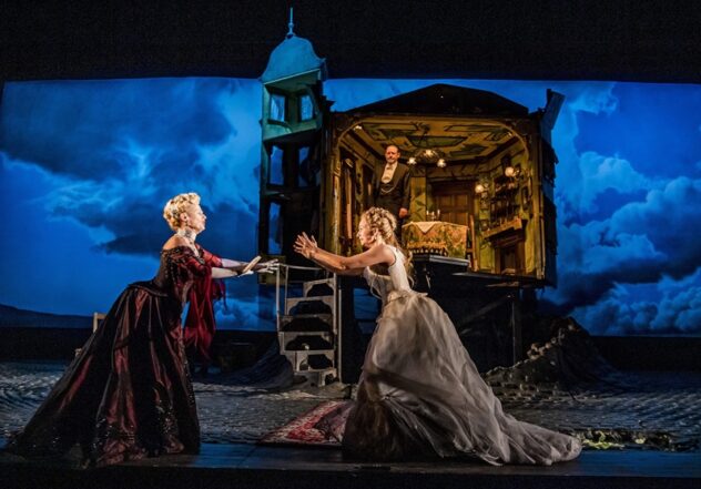 Using an elaborate staging not usually seen in travelling productions,  a large townhouse looms over the stage, set above the cobblestone which it has seemly ripped through. Rain, fog, and a smashed-up phone box are all used to great effect on the ground floor where the Inspector appears. One by one the well-to-do family are interrogated for their part in a heinous crime, moving from well-dressed characters looking down from above to being brought to street level, dirtied and becoming more and more dishevelled as the true extent of their involvement becomes clear.
