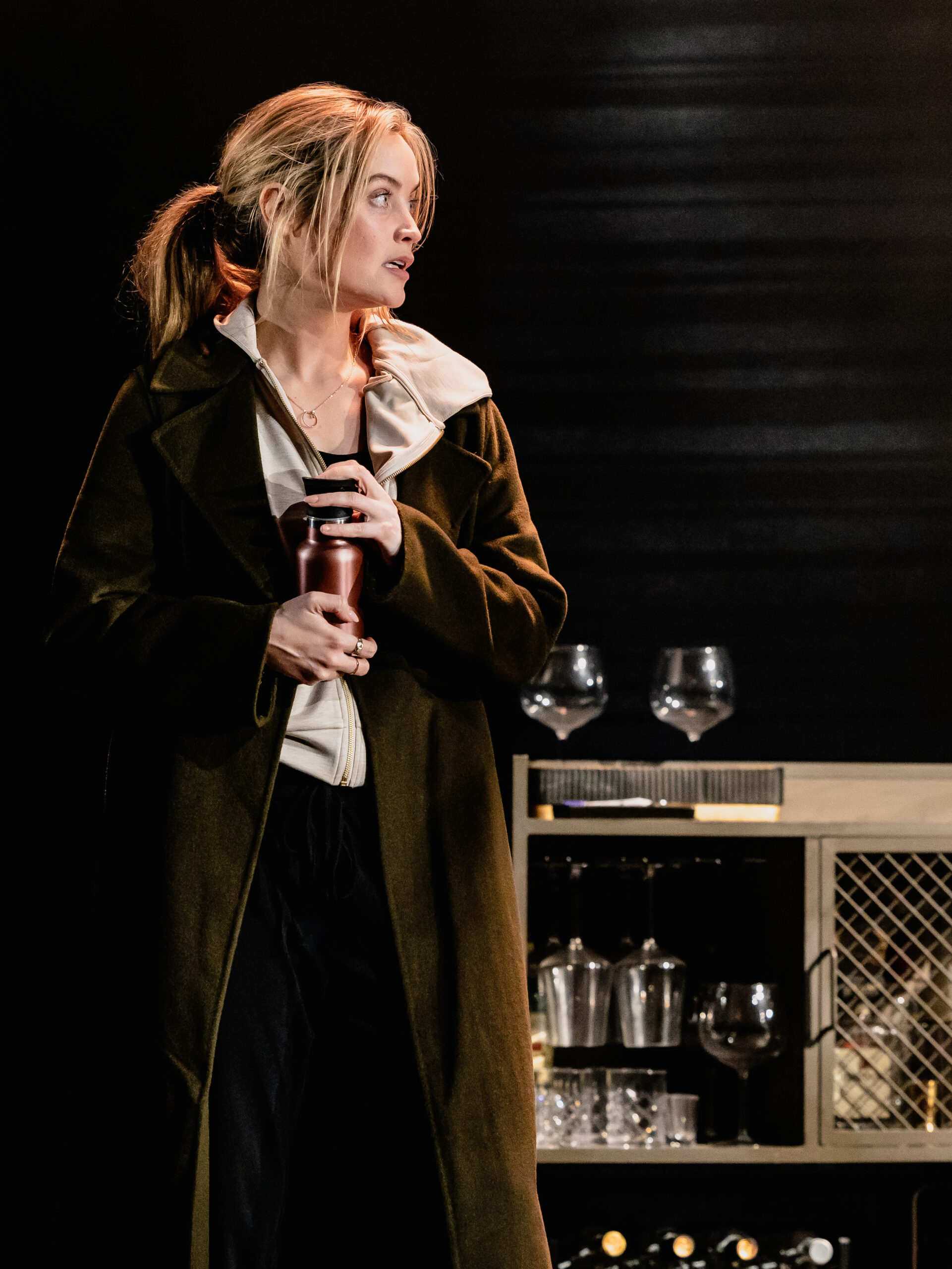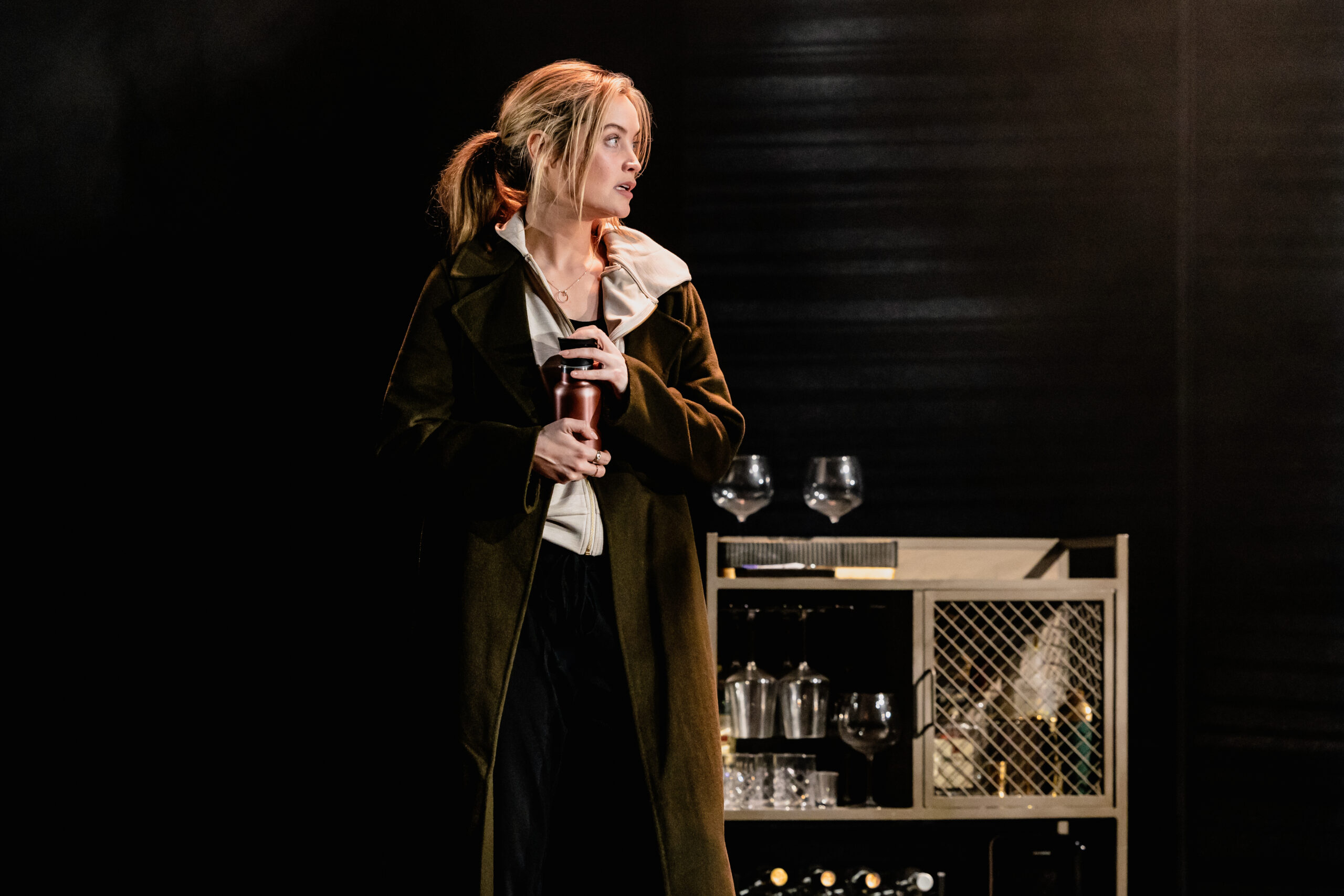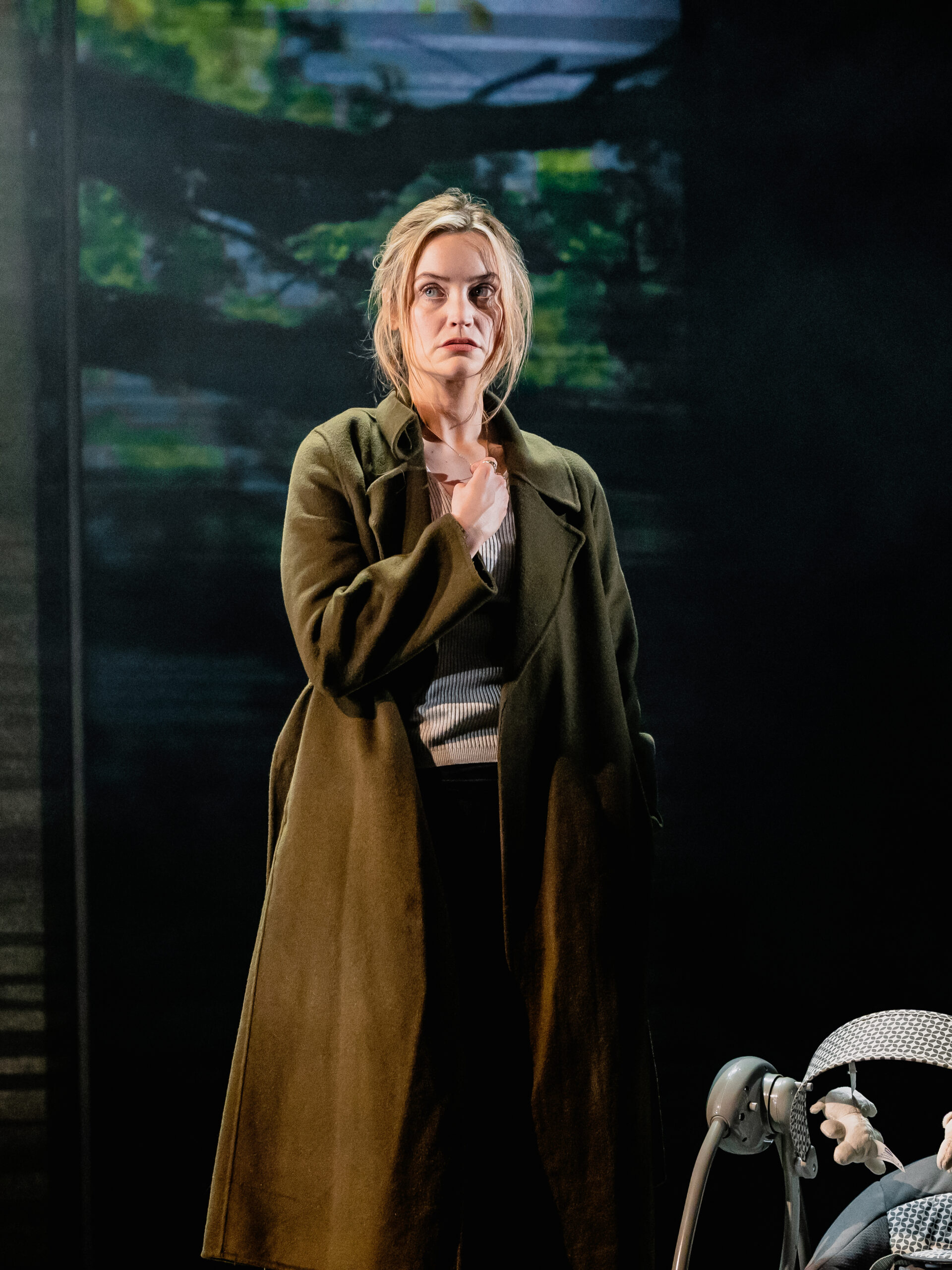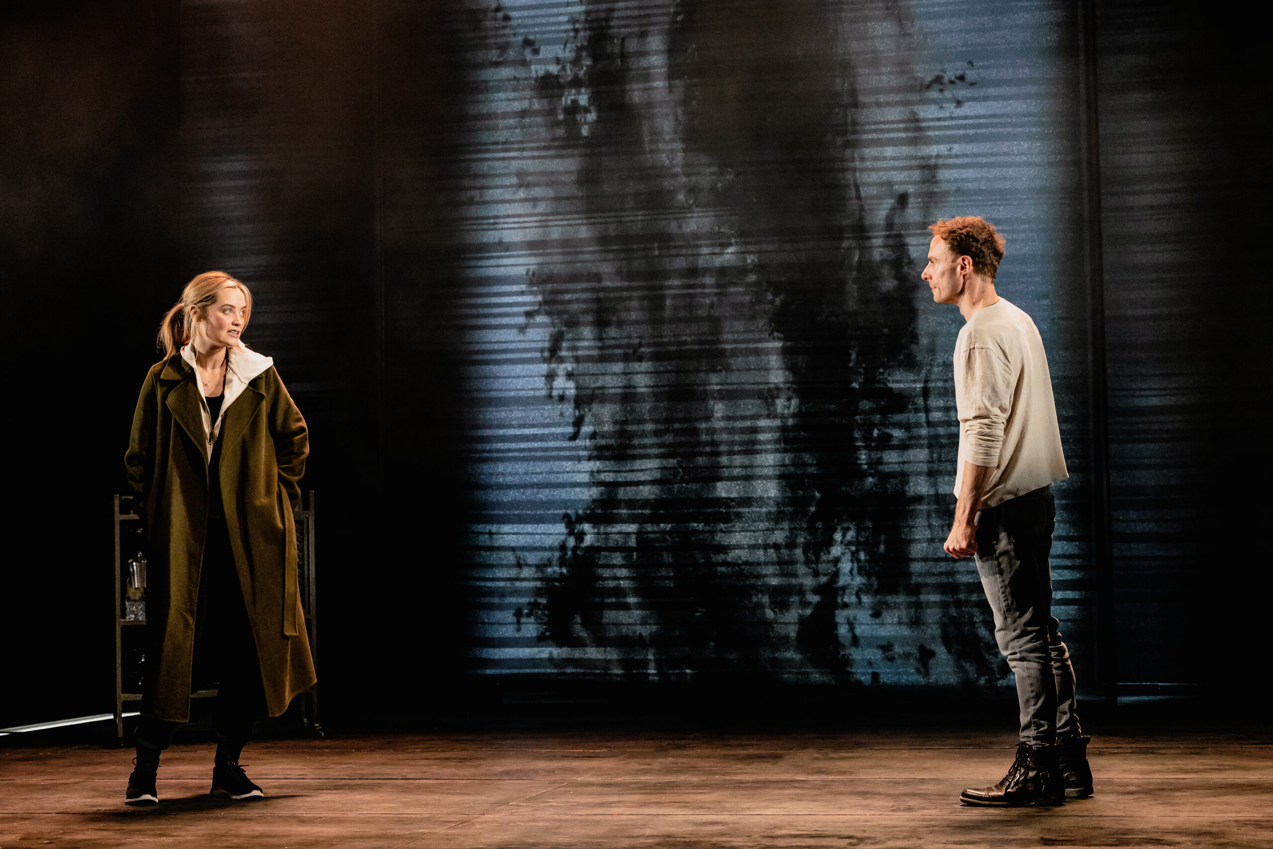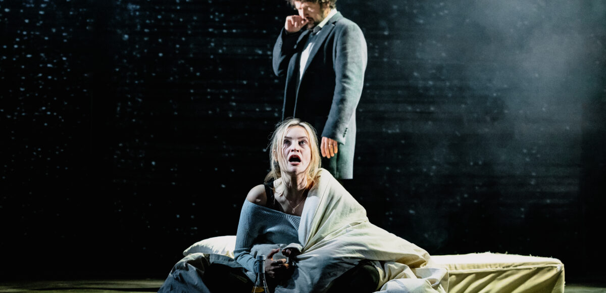 The staging is pared-back but inventive. The set is largely a bare black stage, punctuated only by a drinks cart or messy bed in certain scenes. A screen at the rear doubles as a window, its changing views subtly shifting the atmosphere, while three sheer screens allow the effect of raindrops to fall – a simple but effective touch that draws you further into Rachel’s world. Lighting projected on the floor makes the stage look like train tracks, an effect which is maybe difficult to see when sitting in the stalls.