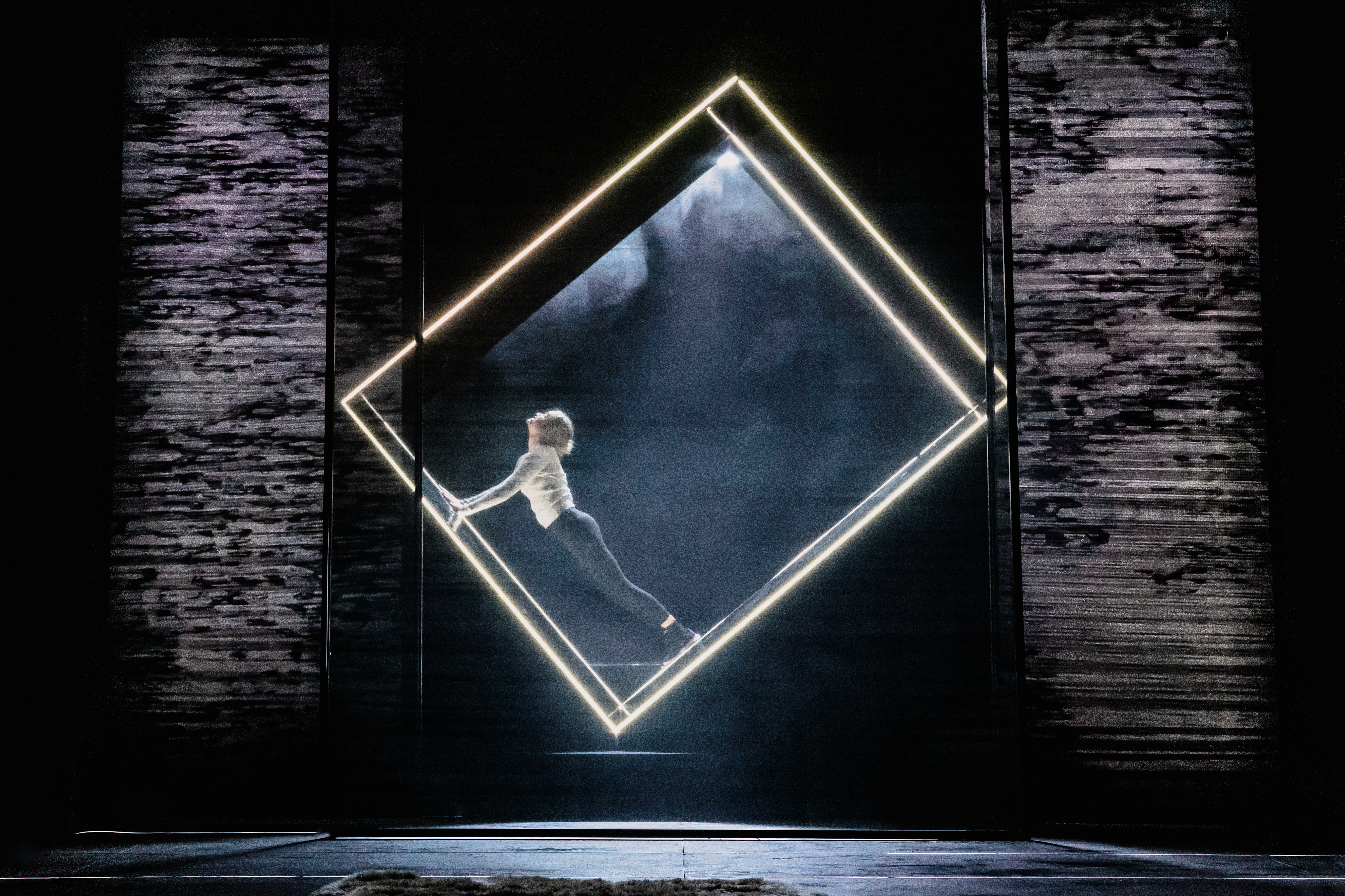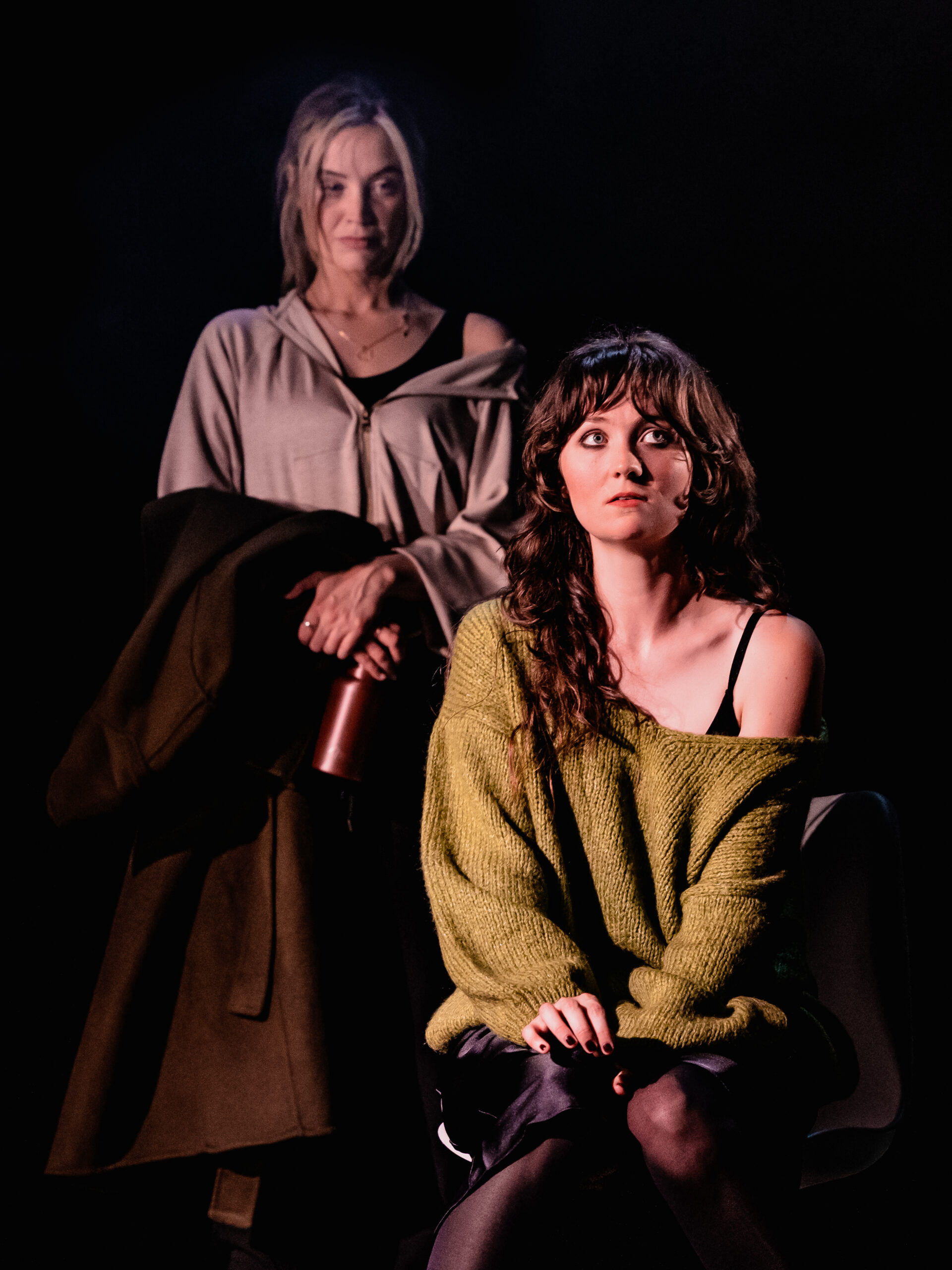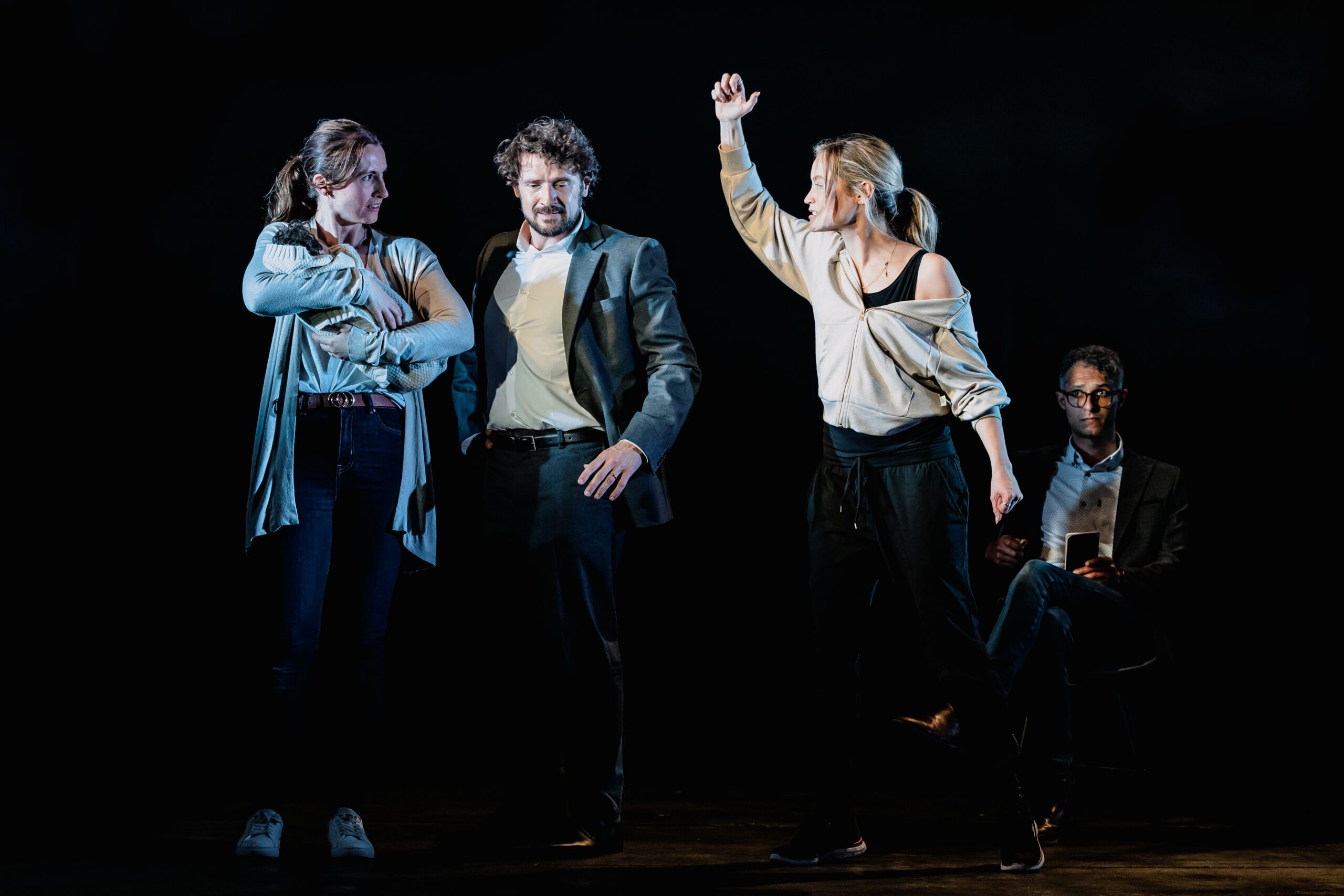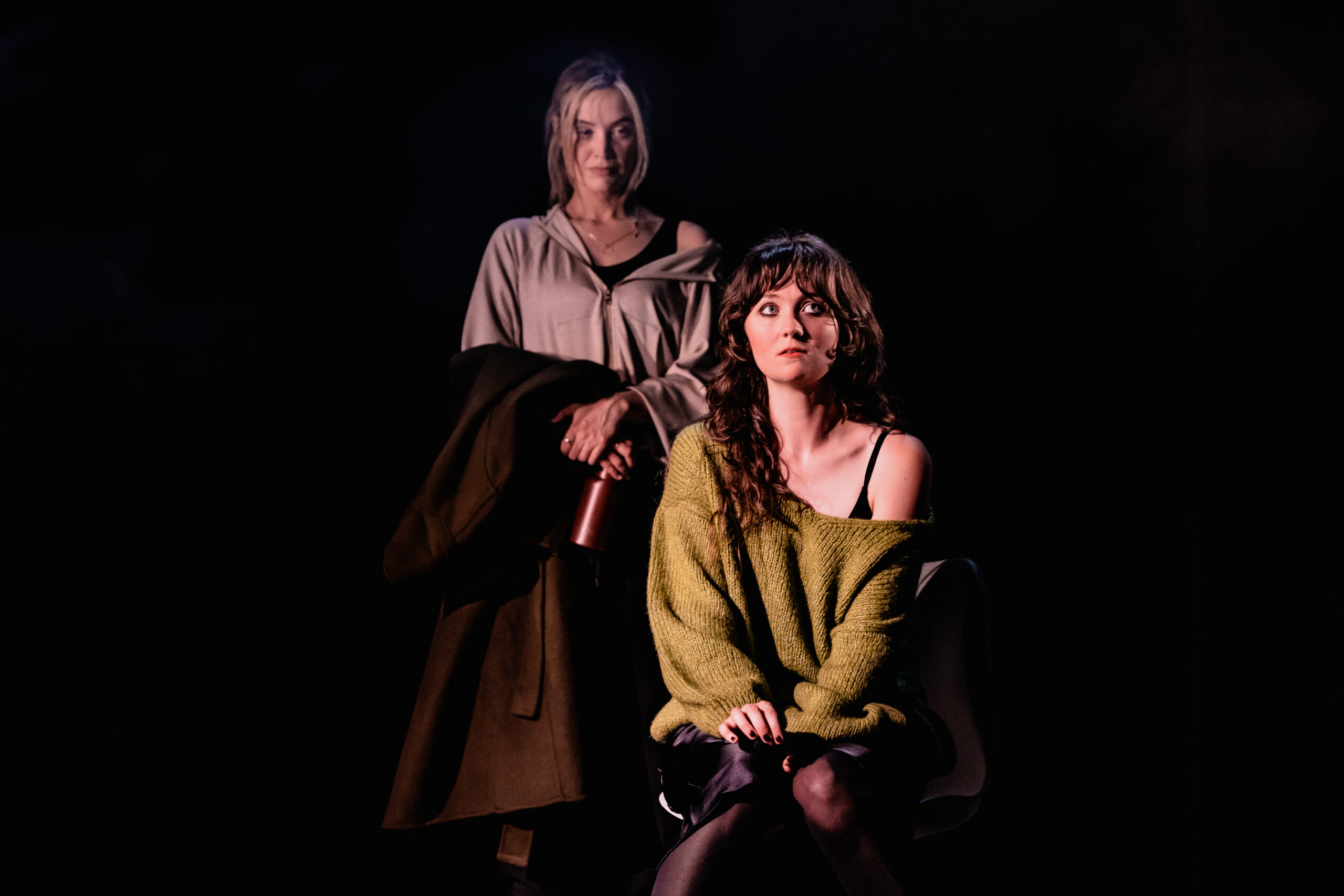 The staging is pared-back but inventive. The set is largely a bare black stage, punctuated only by a drinks cart or messy bed in certain scenes. A screen at the rear doubles as a window, its changing views subtly shifting the atmosphere, while three sheer screens allow the effect of raindrops to fall – a simple but effective touch that draws you further into Rachel’s world. Lighting projected on the floor makes the stage look like train tracks, an effect which is maybe difficult to see when sitting in the stalls.