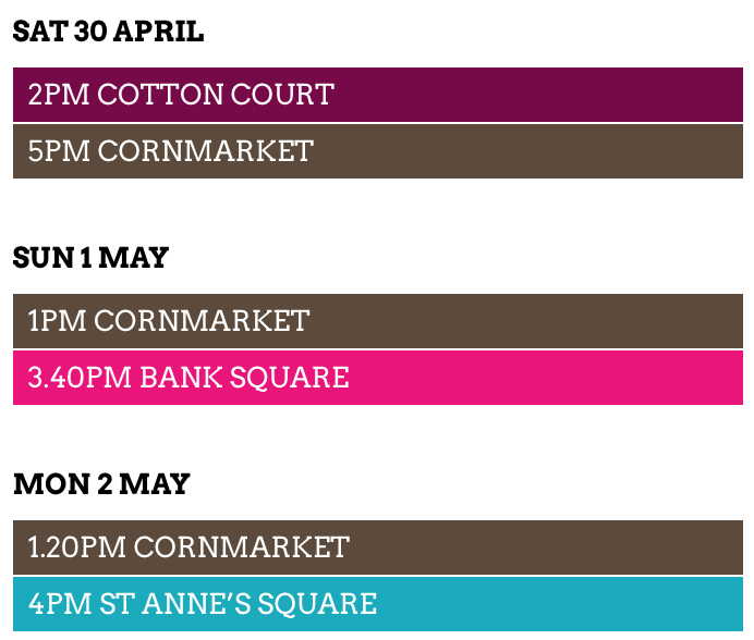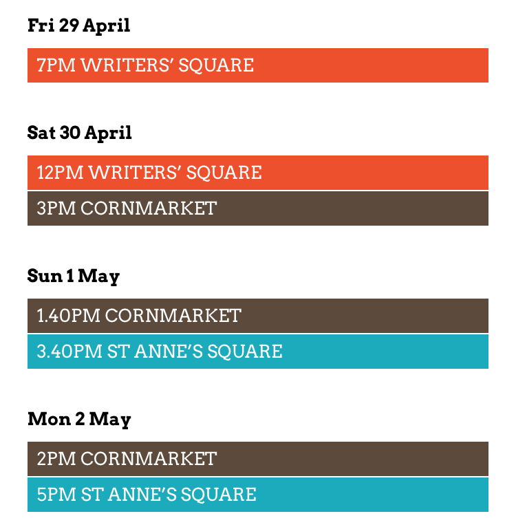 The Festival of Fools is a four day street theatre extravaganza which descends on Belfast over the May Day Bank Holiday Weekend – Friday 29th April – Monday 2nd May which sees both local and international acts perform incredible acrobatic feats, magic, puppetry, circus performances and comedy all across Belfast City Centre and the Cathedral Quarter.